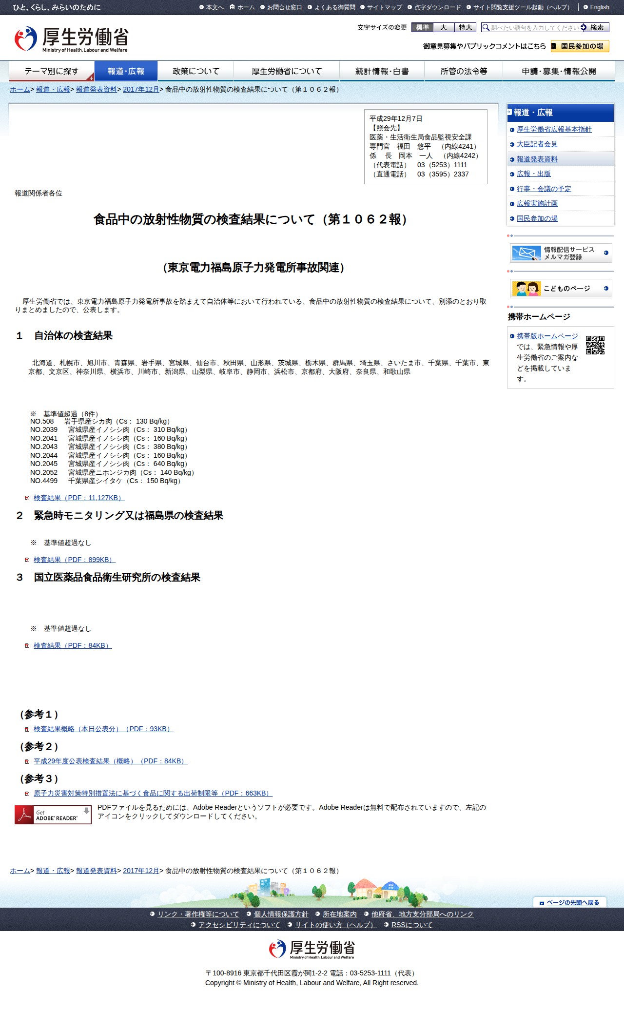 このページは、厚生労働省が2017年12月7日に公表した食品中の放射性物質の検査結果(第1062報)についてです。福島原発事故後、全国30の自治体で実施された検査結果をまとめています。北海道から和歌山県まで広範囲での検査が行われ、基準値超過は8件でした。内訳は岩手県産シカ肉1件、宮城県産イノシシ肉5件、宮城県産ニホンジカ肉1件、千葉県産シイタケ1件です。緊急時モニタリングと福島県検査結果、国立医薬品食品衛生研究所の検査では基準値超過がありませんでした。