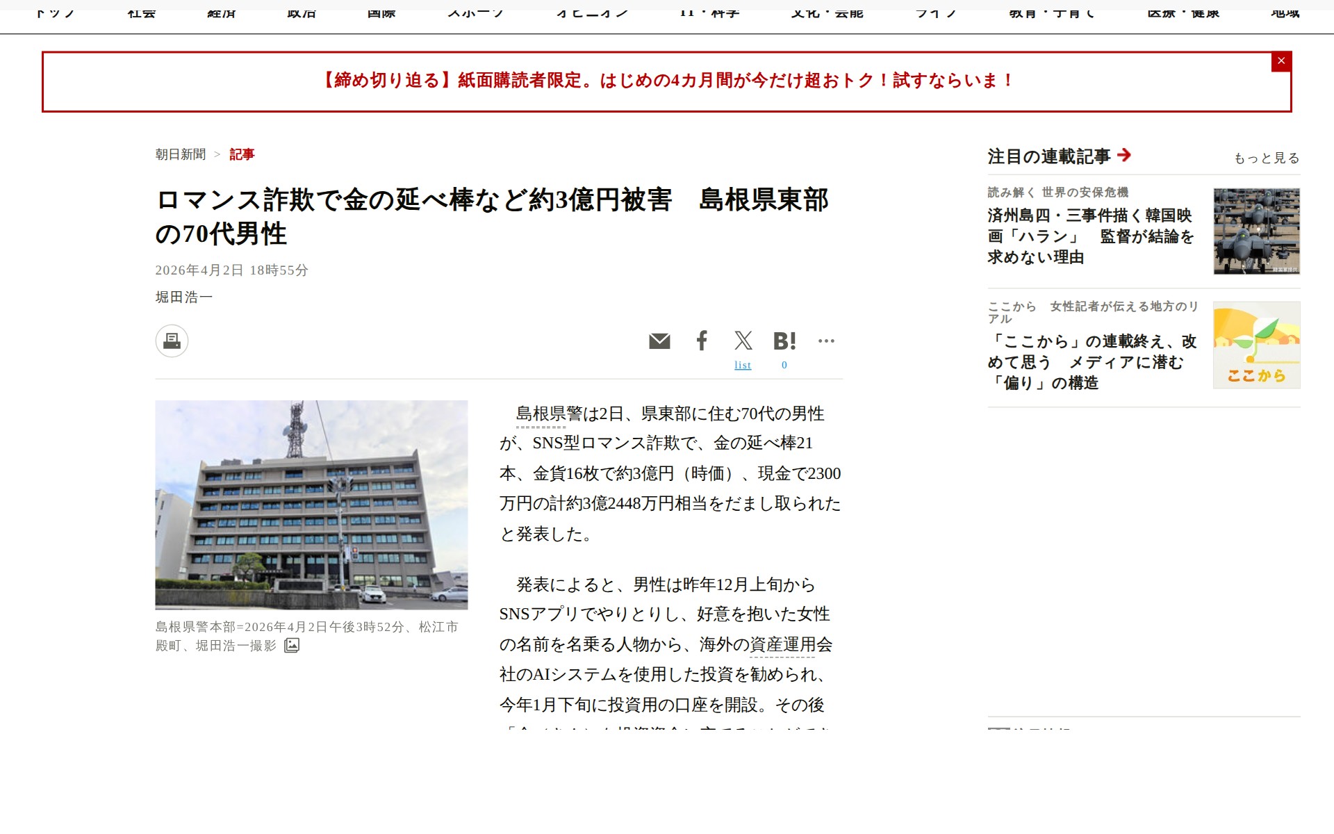 ![ロマンス詐欺で金の延べ棒など約3億円被害 島根県東部の70代男性 [島根県]:朝日新聞 - 保存されたスクリーンショット](https://pub-f6fa8ca7bebe4069bff3224f9a8f5334.r2.dev