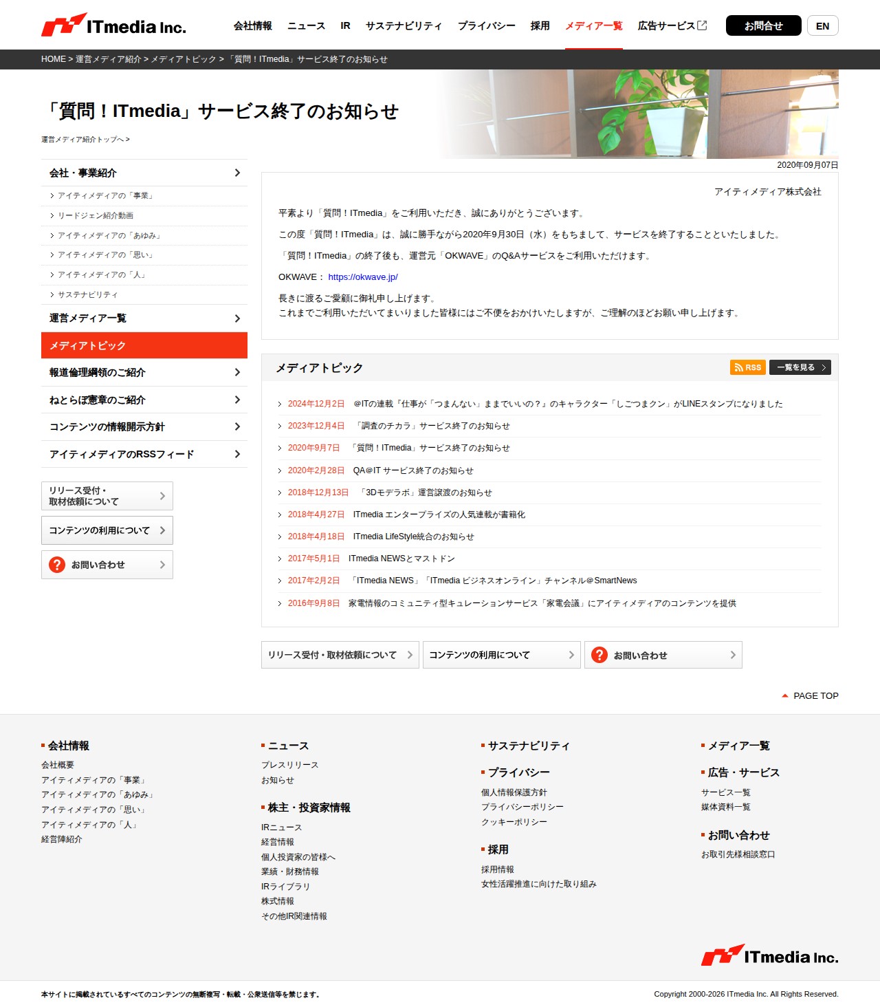 「質問!ITmedia」サービス終了のお知らせ - 運営メディア紹介 - 保存されたスクリーンショット