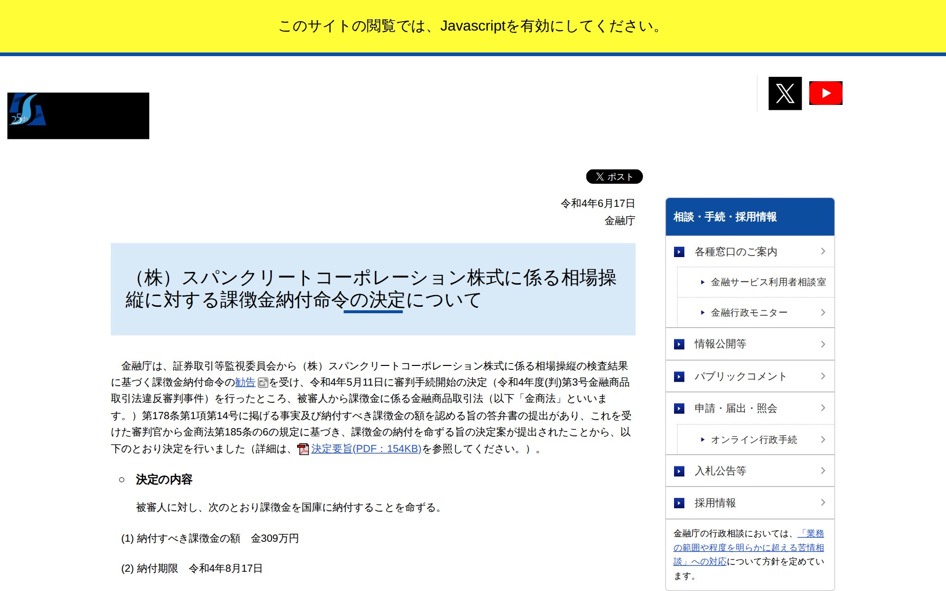 (株)スパンクリートコーポレーション株式に係る相場操縦に対する課徴金納付命令の決定について:金融庁