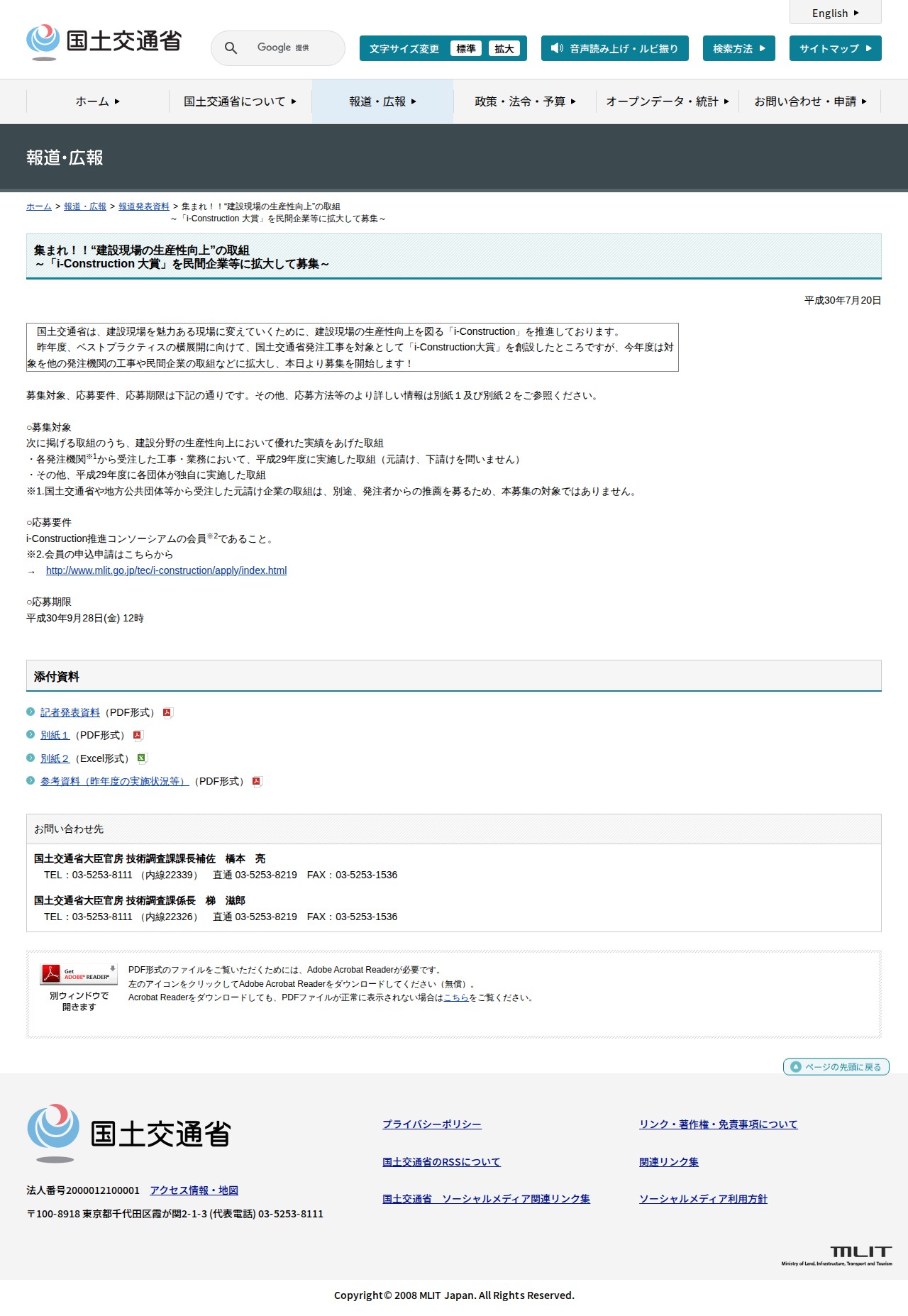 報道発表資料:集まれ!!“建設現場の生産性向上”の取組<br>~「i-Construction 大賞」を民間企業等に拡大して募集~ - 国土交通省