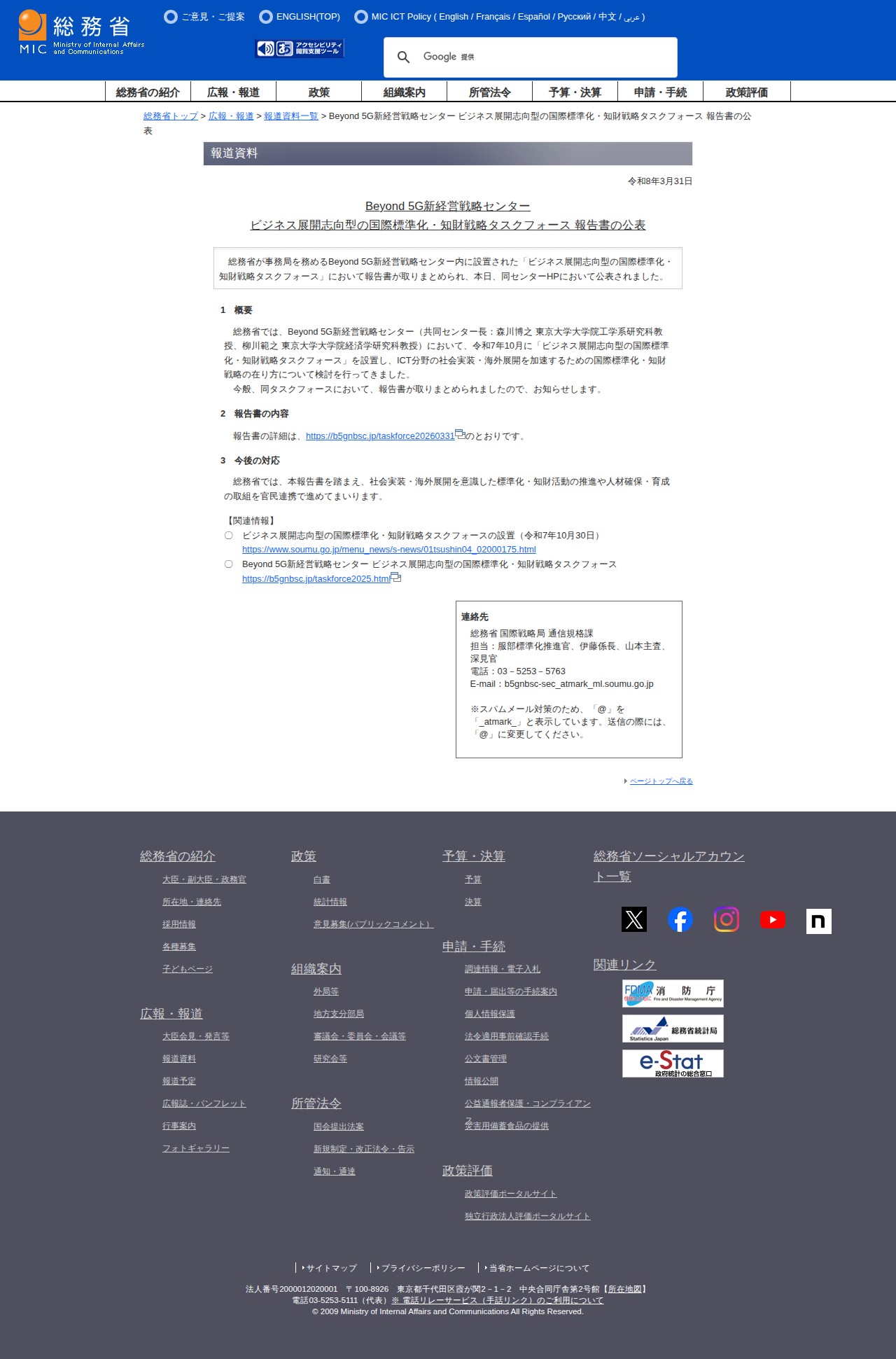 このページは、総務省が事務局を務めるBeyond 5G新経営戦略センター内に設置された「ビジネス展開志向型の国際標準化・知財戦略タスクフォース」の報告書公表についての報道資料である。同タスクフォースは令和7年10月に設置され、ICT分野の社会実装・海外展開を加速するための国際標準化・知財戦略の在り方について検討してきた。報告書の詳細はセンターのHP上で公開されている。総務省は今後、本報告書を踏まえ、標準化・知財活動の推進や人材確保・育成の取組を官民連携で進める方針である。