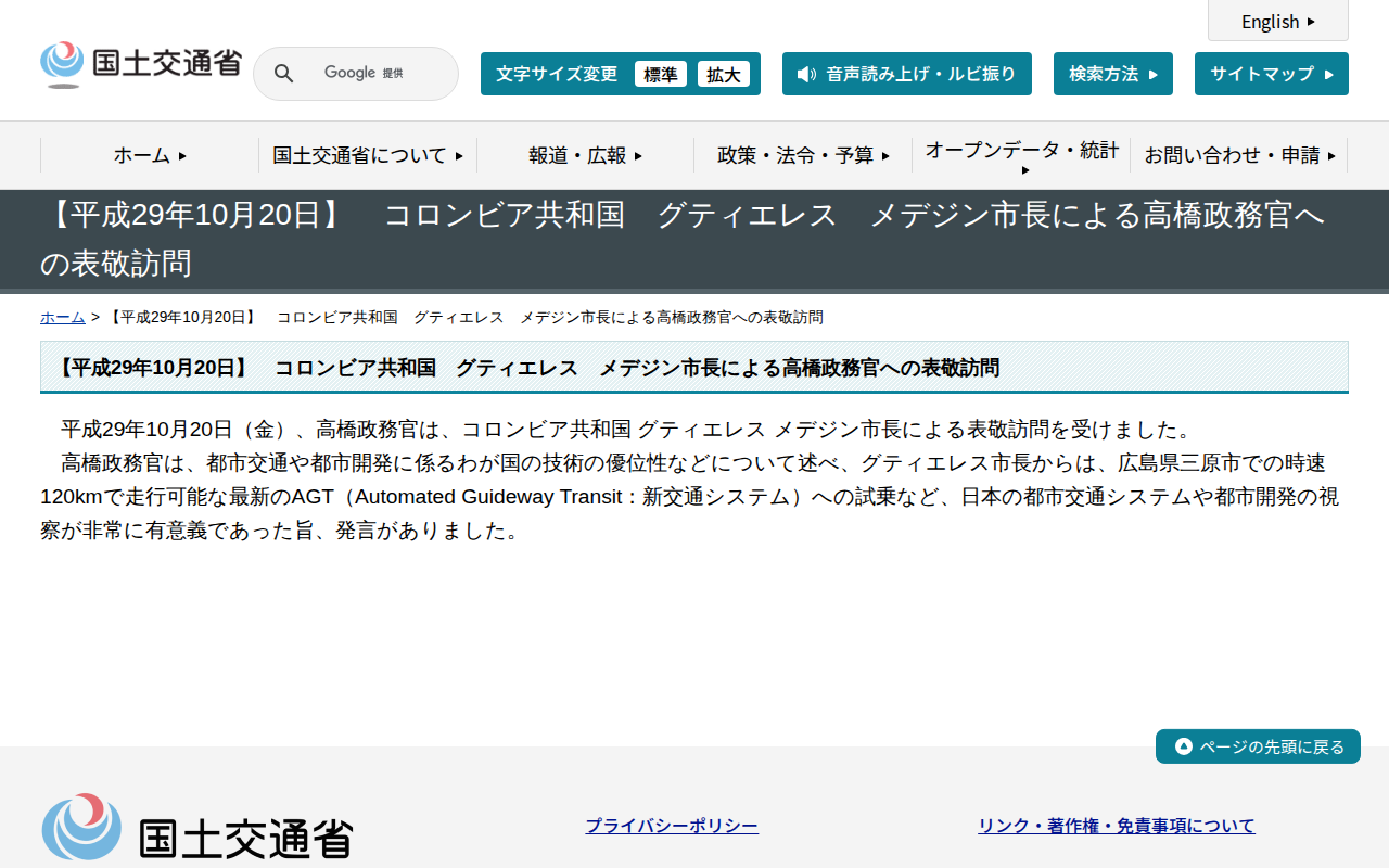 【平成29年10月20日】 コロンビア共和国 グティエレス メデジン市長による高橋政務官への表敬訪問 - 国土交通省 - 保存されたスクリーンショット
