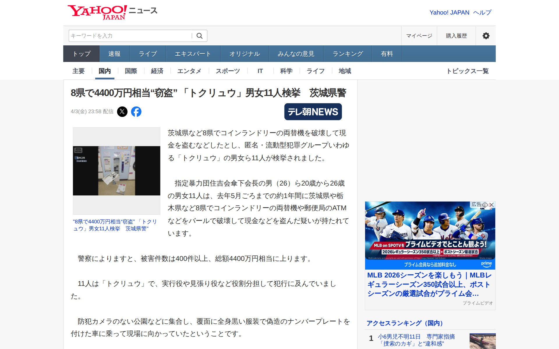 このページは、茨城県など8県でコインランドリーの両替機やATMを破壊して現金を盗んだ容疑で、匿名・流動型犯罪グループ「トクリュウ」の男女11人が検挙されたというニュースを報じている。指定暴力団住吉会傘下の20~26歳の11人は、約1年間で8県で400件以上の犯行を行い、総額4400万円相当を盗んだ疑い。防犯カメラのない場所に集合し、偽造ナンバープレート付きの車で現場に向かっていた。9人が容疑を認め、2人は黙秘している。