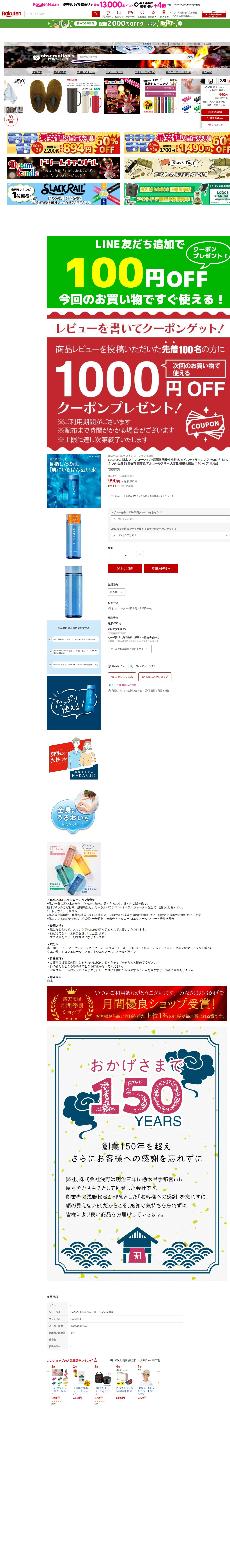 【楽天市場】HADASUI 肌水 スキンローション 保湿液 弱酸性 化粧水 モイスチャライジング 400ml うるおい かさつき 全身 顔 無香料 無着色 アルコールフリー 大容量 基礎化粧品 スキンケア 日用品:オブザベーションズ - 保存されたスクリーンショット