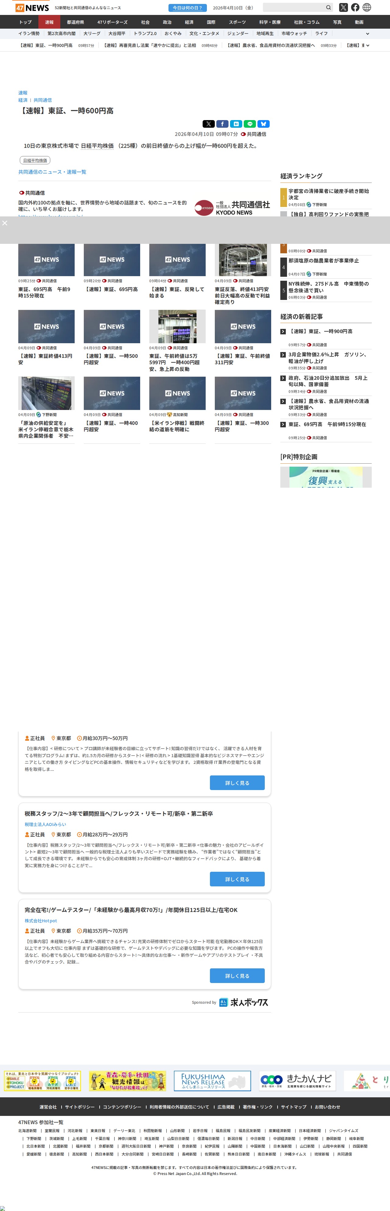 このページは、2026年4月10日の東京株式市場の速報を伝えるニュース記事である。日経平均株価が前日終値から一時600円を超える上げ幅を記録したことを報じている。記事は共同通信による速報で、47都道府県の新聞社と共同通信が運営するニュースサイト「よんななニュース」に掲載されている。同日の市場動向に関する複数の速報が時系列で記載されており、経済情報を中心とした内容となっている。