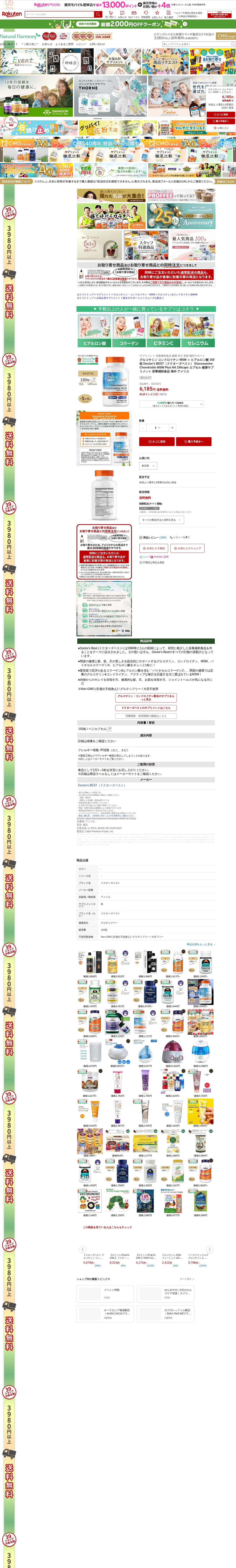 このページは、楽天市場で販売されているドクターズベスト製グルコサミン・コンドロイチン・MSM・ヒアルロン酸サプリメント(150粒)の商品情報です。1990年設立の医師主導企業による研究ベースの栄養補助食品で、関節の健康と髪・肌・爪の美しさをサポートします。バイオセルコラーゲン、グルコサミン、コンドロイチン、MSM、ヒアルロン酸を配合。Non-GMO、グルテンフリー、大豆不使用。価格は6,185円で送料無料。米国より1~5営業日以内に発送。1日1~5粒の摂取が目安です。