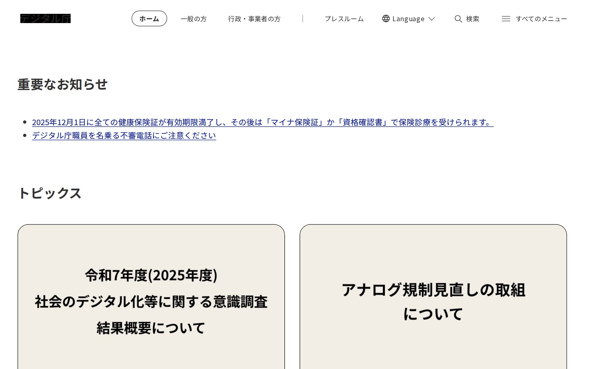 このページはデジタル庁の公式サイトです。2025年12月に健康保険証が有効期限満了し、マイナ保険証または資格確認書での保険診療が必要になることを案内しています。トピックスでは、デジタル行政サービス改善のための国民意識調査ダッシュボードの更新、地方公共団体向け支援の充実、2026年度ガバメントクラウド整備の新規サービス決定などを報告しています。また法人ベース・レジストリの2026年3月稼働やGビズポータルのリリース予定を公表。マイナンバーカードやマイナポータル、e-Govポータルなど、国民や事業者向けの各種デジタルサービスを提供しています。