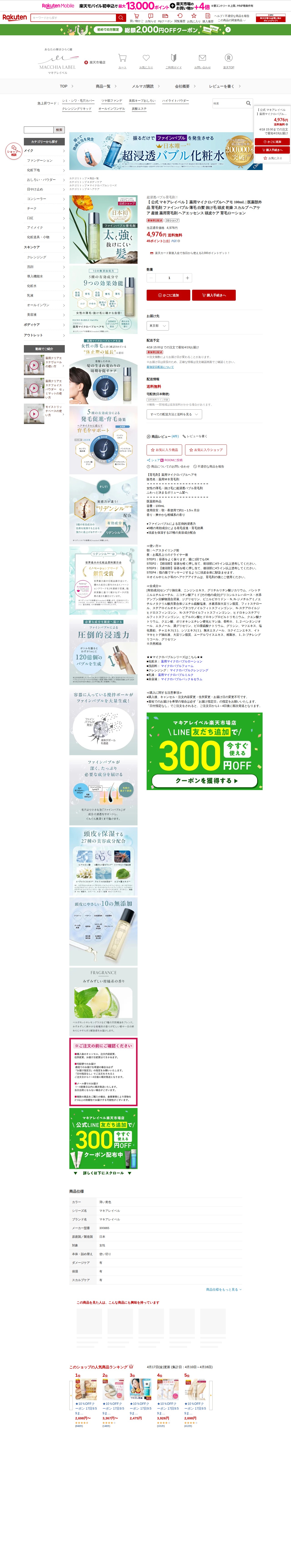 このページはマキアレイベルの薬用マイクロバブルヘアモ(100mL)の商品紹介ページです。価格は4,976円で送料無料。医薬部外品の育毛剤で、ファインバブル技術により頭皮への浸透力を実現します。センブリ抽出液やニンジンエキスなど5種の有効成分が発毛促進・育毛効果を提供し、27種の美容成分で頭皮を保湿します。朝夜の使用で約1~1.5ヶ月分。爽やかな柑橘系の香りが特徴で、薄毛・抜け毛・白髪・産後の頭皮ケアに対応した女性向けの育毛ローションです。