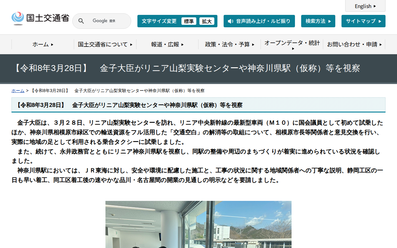 【令和8年3月28日】 金子大臣がリニア山梨実験センターや神奈川県駅(仮称)等を視察 - 国土交通省 - 保存されたスクリーンショット