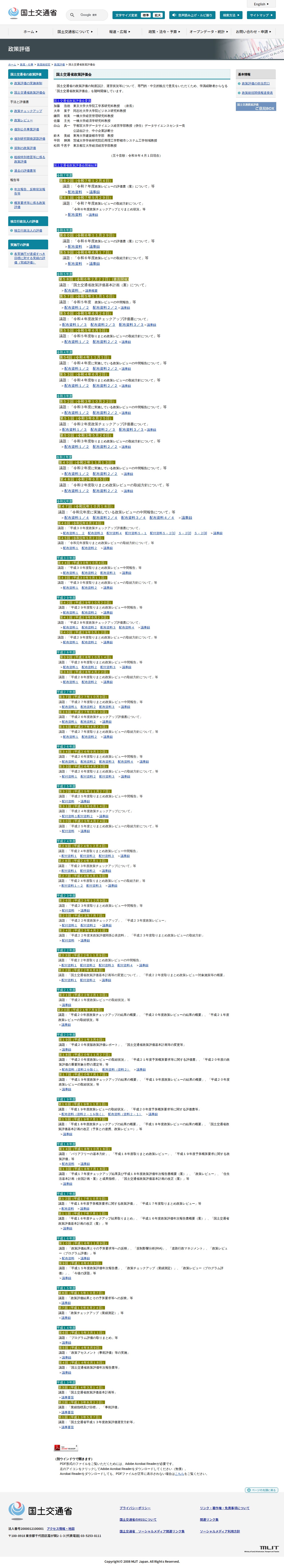 このページは、国土交通省政策評価会に関する情報を掲載しています。同会は、国土交通省の政策評価の制度設計・運営状況について、学識経験者による専門的・中立的な意見を得るため随時開催されています。委員は東京大学、同志社大学、一橋大学など著名大学の教授8名で構成されています。ページには令和2年度から令和7年度までの開催結果が記載され、各回の議題、配布資料、議事録へのリンクが提供されています。政策レビューの評価書や取組方針などが主な議題となっています。