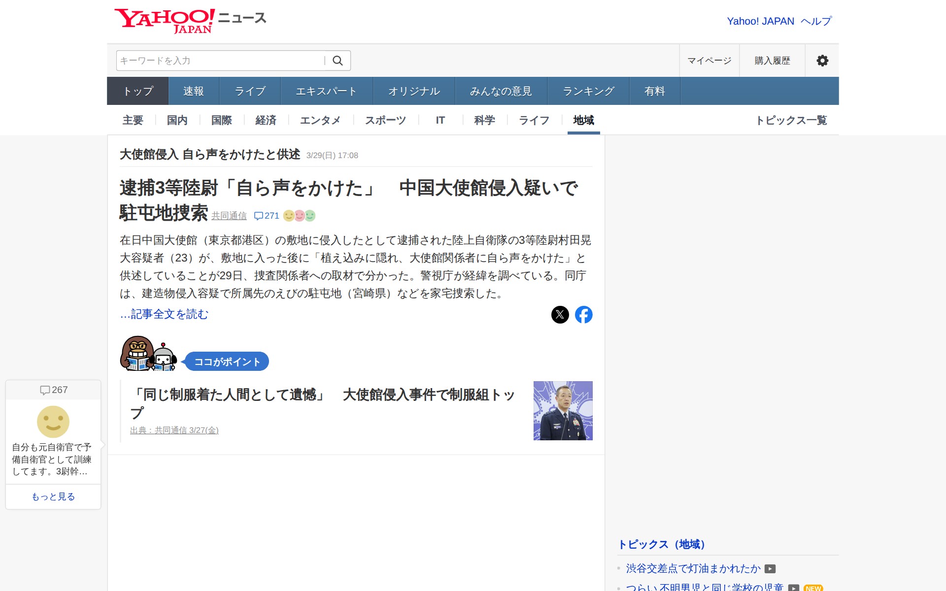 このページは、在日中国大使館の敷地に侵入したとして逮捕された陸上自衛隊3等陸尉村田晃大容疑者(23)の事件を報じています。容疑者は敷地内の植え込みに隠れた後、大使館関係者に自ら声をかけたと供述しており、警視庁が建造物侵入容疑で所属するえびの駐屯地を家宅捜索しました。コメント欄では、自衛官による前代未聞の行為に対する困惑や、容疑者の真の意図や精神状態への疑問が寄せられています。