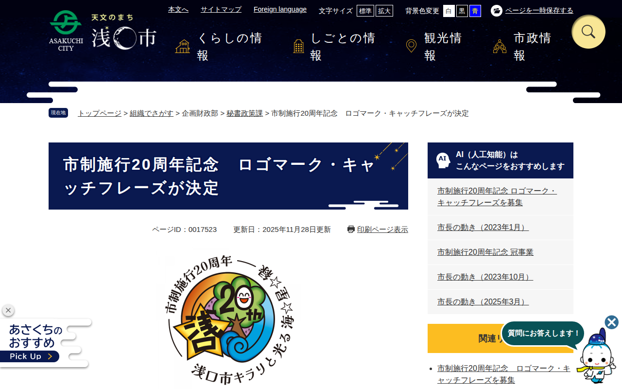 市制施行20周年記念 ロゴマーク・キャッチフレーズが決定 - 浅口市公式ホームページ(秘書政策課)