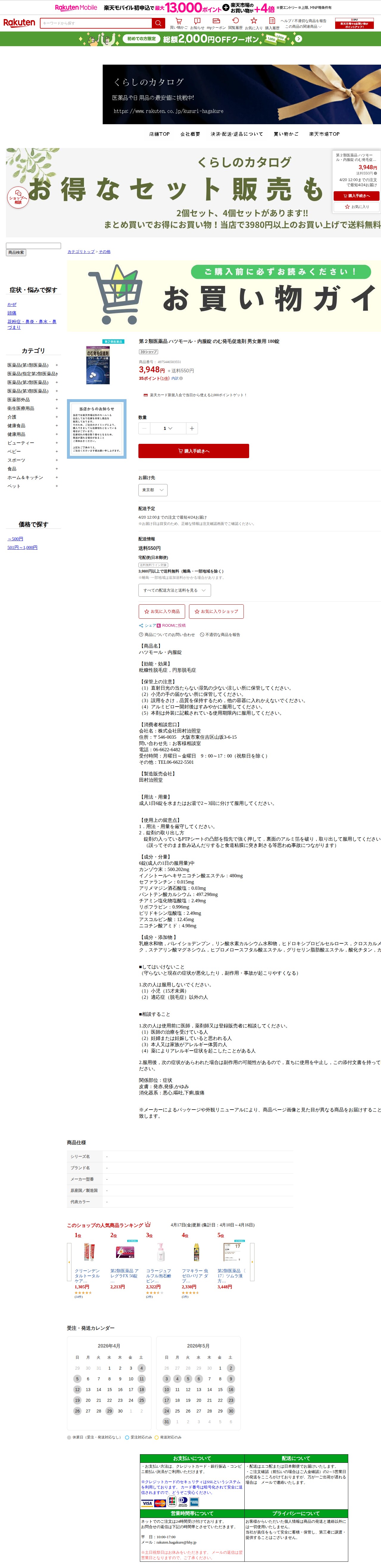 このページは、楽天市場で販売されている第2類医薬品「ハツモール・内服錠」の商品ページです。男女兼用の飲む発毛促進剤で、180錠入り3,948円(送料550円)。粃糠性脱毛症と円形脱毛症に効能があります。成人は1日6錠を2~3回に分けて水またはお湯で服用します。カンゾウ末やビタミン類など複数の有効成分を含有。15才未満の小児や妊婦は使用禁止。製造販売は株式会社田村治照堂。