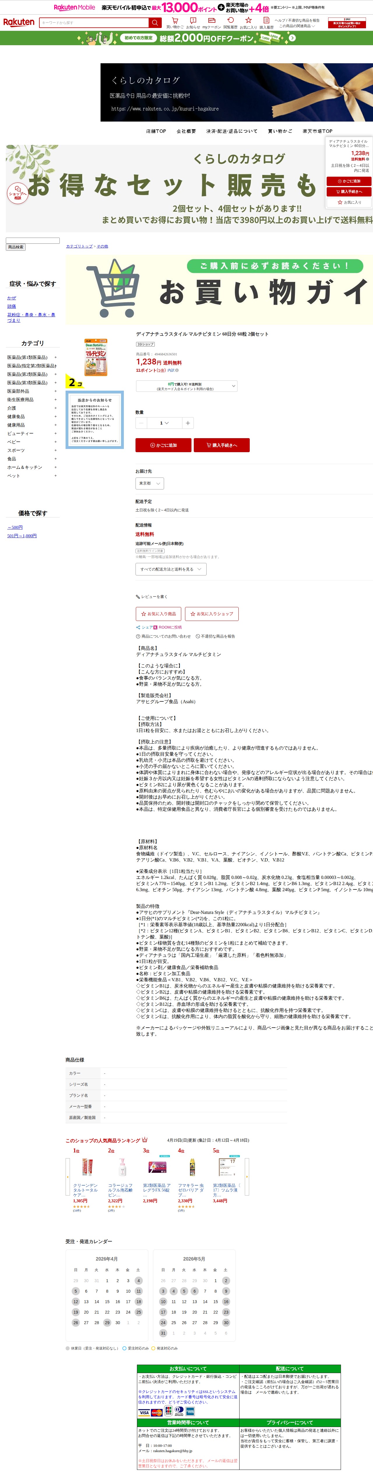 このページは、楽天市場で販売されているアサヒグループ食品のサプリメント「ディアナチュラスタイル マルチビタミン 60日分 60粒 2個セット」の商品情報ページです。価格は1,238円で送料無料。食事のバランスや野菜不足が気になる方向けで、1日1粒を水またはお湯とともに摂取します。12種類のビタミンを配合し、栄養素等表示基準値の1日分を1粒に凝縮しています。土日祝を除く2~4日以内に発送予定です。
