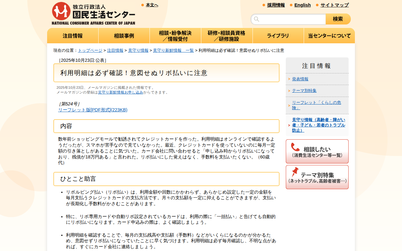 利用明細は必ず確認!意図せぬリボ払いに注意(見守り情報)_国民生活センター