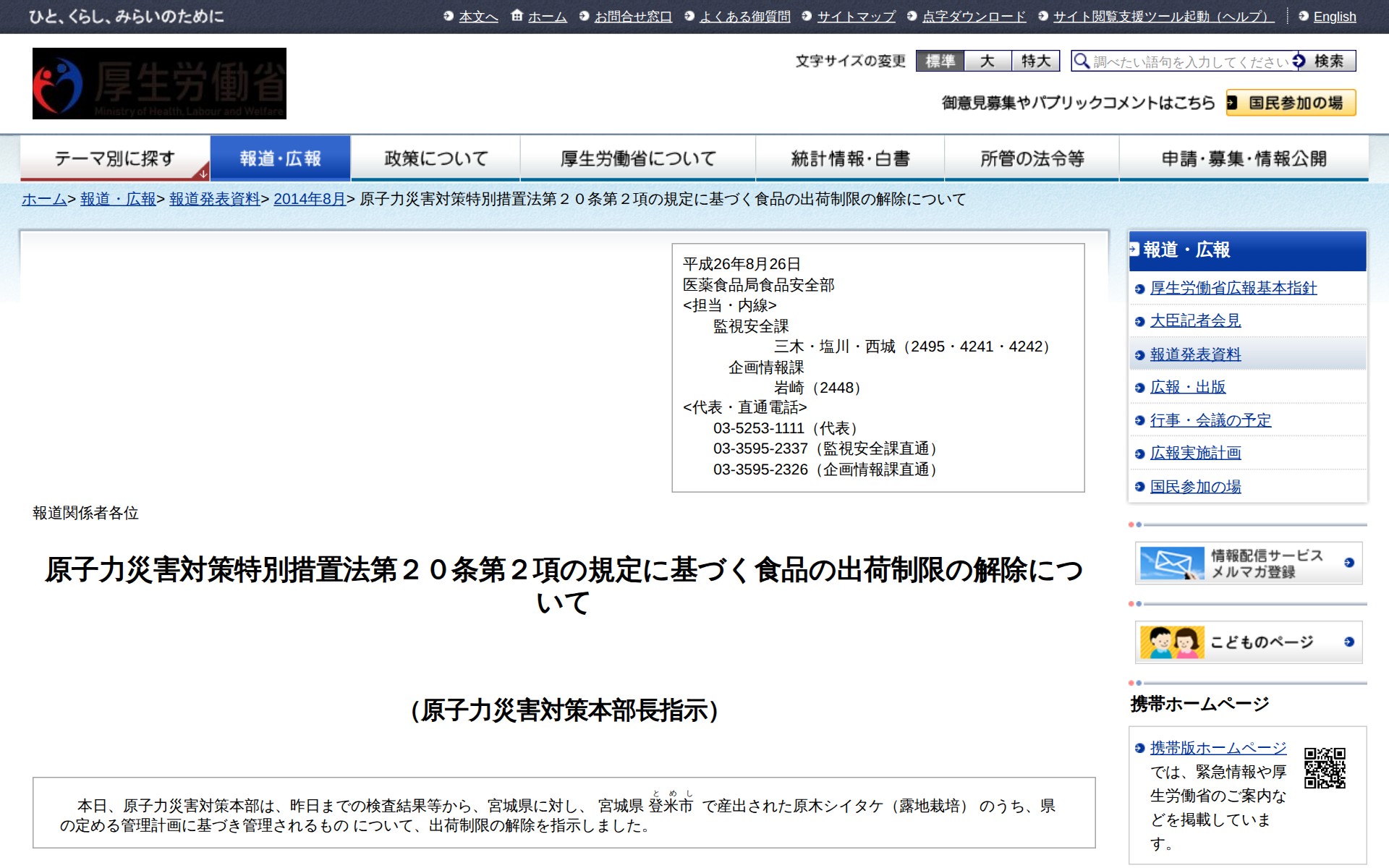 このページは、2014年8月26日の厚生労働省の報道発表資料で、原子力災害対策特別措置法に基づく食品の出荷制限解除について述べている。原子力災害対策本部は、検査結果等から宮城県登米市で産出された原木シイタケ(露地栽培)のうち、県の定める管理計画に基づき管理されるものについて、出荷制限の解除を指示した。この解除により、対象の原木シイタケは出荷が可能になる。また、原子力災害対策特別措置法の規定に基づく食品の出荷制限及び摂取制限の指示一覧も示されている。