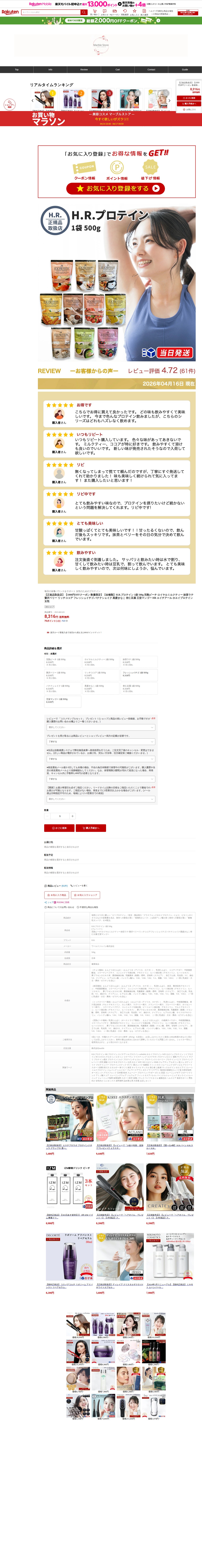 このページは、楽天市場で販売されているH.R.プロテイン500gの商品ページです。女性向けのホエイプロテインで、植物性タンパク質と動物性タンパク質をW配合し、ビタミンやミネラルを含んでいます。完熟ピーチ、ロイヤルミルクティー、抹茶ラテなど10種類のフレーバーから選べます。価格は8,316円で送料無料、1000円OFFクーポン対象です。日本製で、レビュー投稿でコスメサンプルセットのプレゼント特典があります。