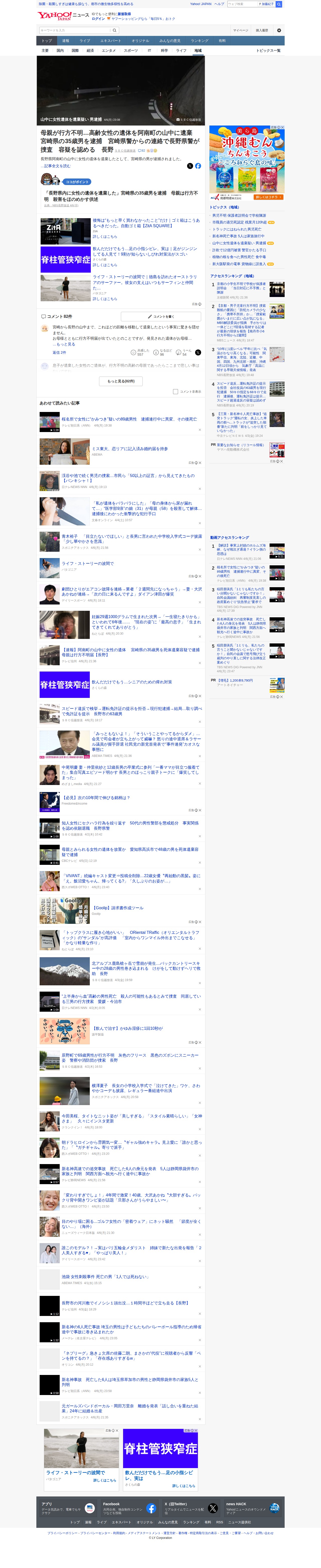 このページは、長野県阿南町の山中で女性の遺体が遺棄された事件について報道しています。宮崎県の35歳男が死体遺棄容疑で逮捕されました。被害者は行方不明届が出ていた高齢女性で、容疑者の母親と見られています。宮崎県警からの情報提供により長野県警が捜査を進めており、容疑者は容疑を認めています。遠距離での遺棄という事実や、親子間での悲劇的な事件であることに対して、コメント欄では驚きと同情の声が上がっています。