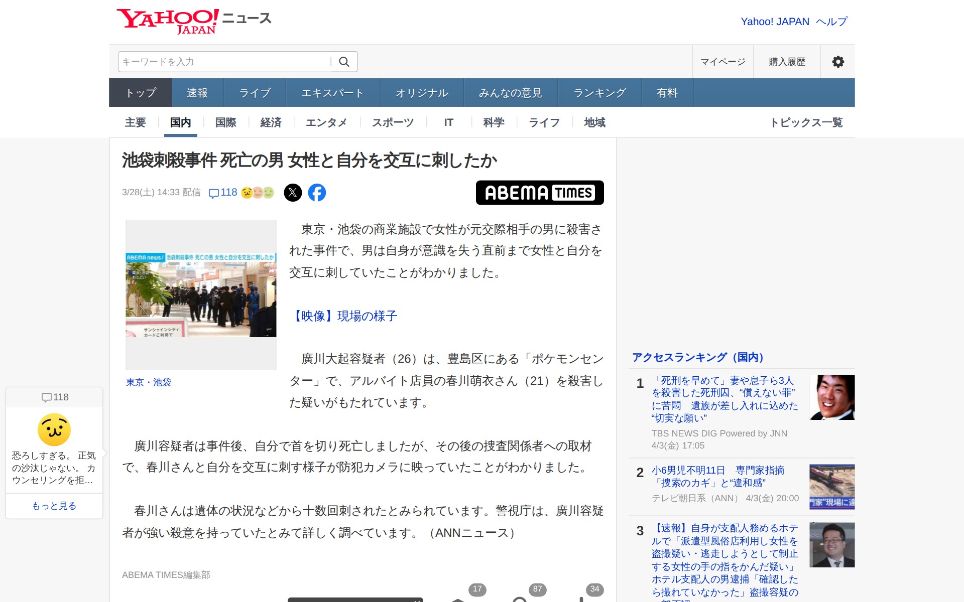 池袋刺殺事件 死亡の男 女性と自分を交互に刺したか(ABEMA TIMES) - Yahoo!ニュース