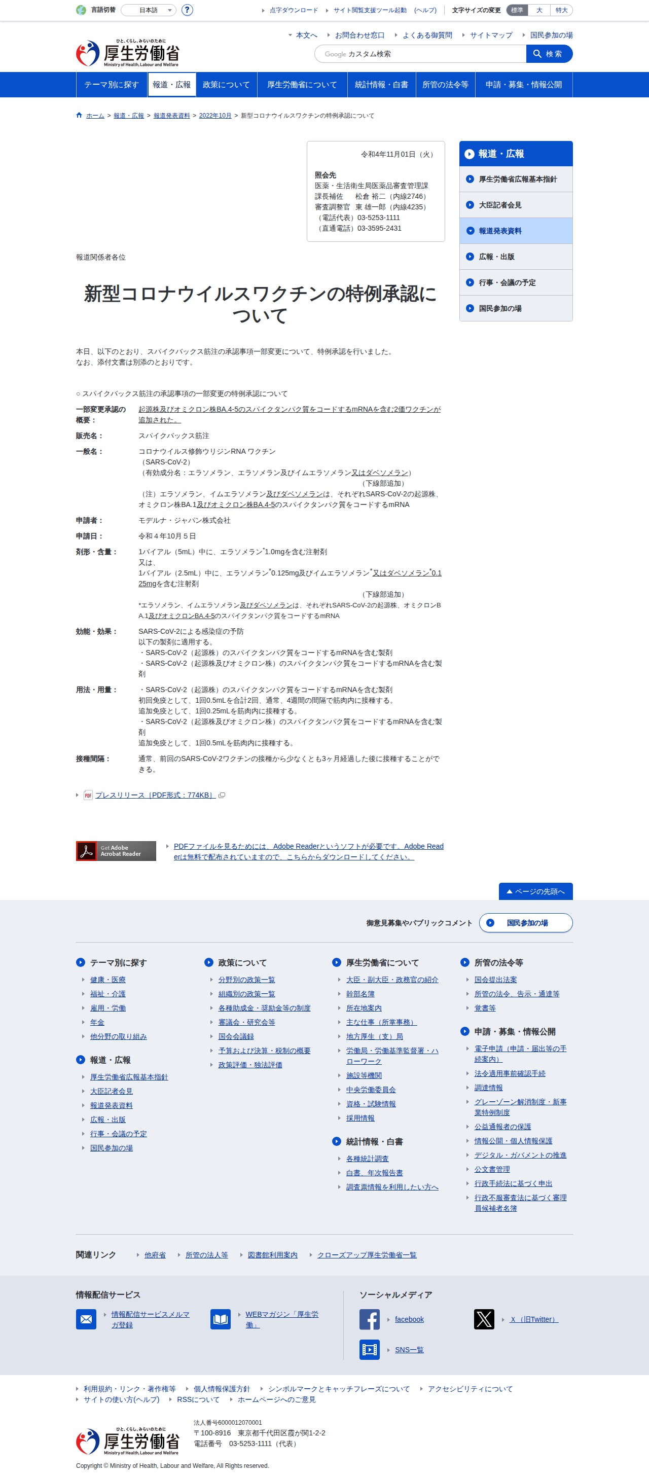 このページは、厚生労働省が新型コロナウイルスワクチン「スパイクバックス筋注」の承認事項一部変更について特例承認したことを公表しています。起源株およびオミクロン株BA.4-5のスパイクタンパク質をコードするmRNAを含む2価ワクチンが追加されました。モデルナ・ジャパン株式会社の申請に基づく承認で、申請日は2022年10月5日です。用法用量や接種間隔など詳細な情報が記載されており、感染症予防の効能・効果が認められています。