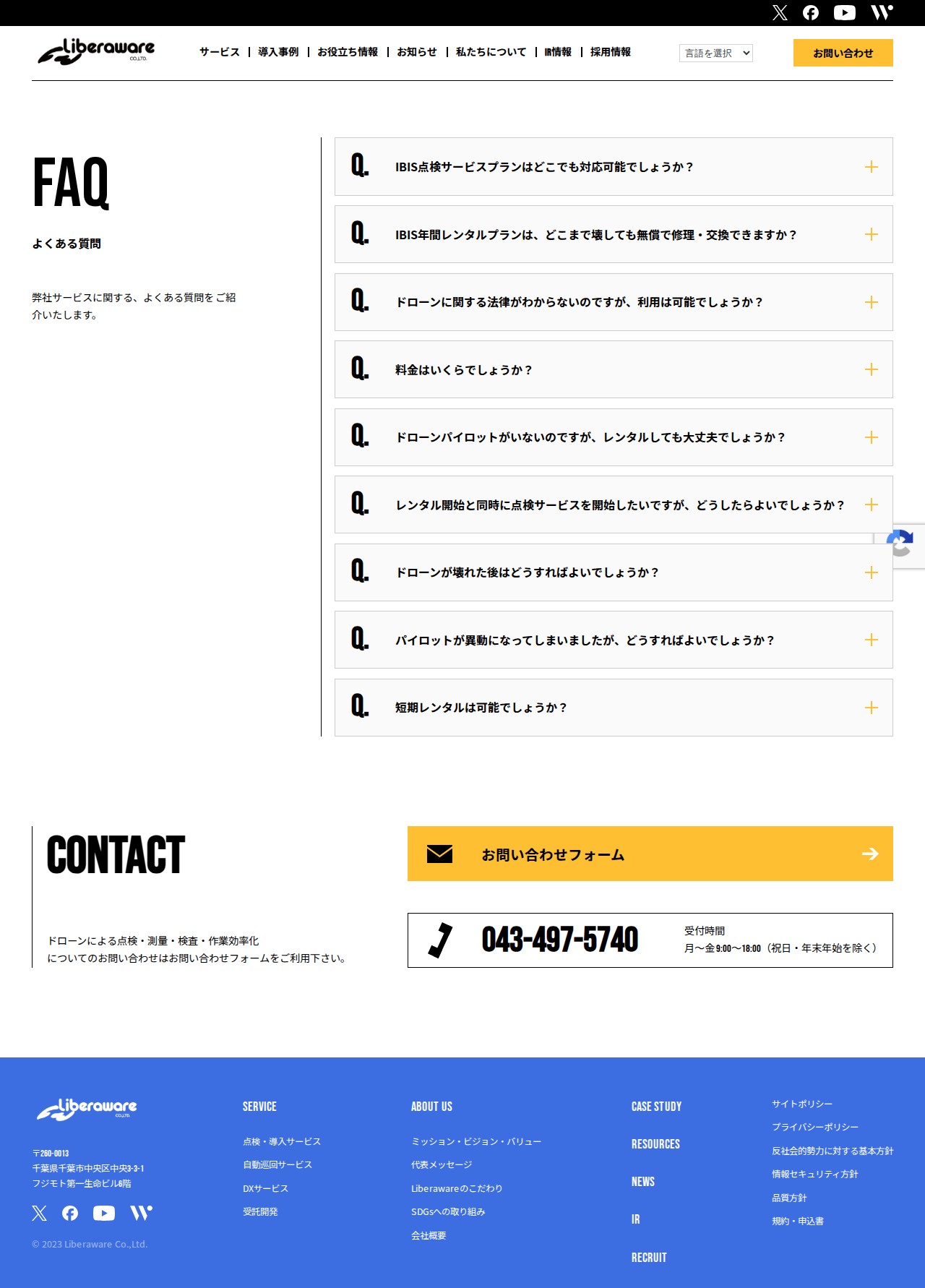 このページは、ドローンの点検・測量・検査サービスを提供するリベラウェア社のよくある質問(FAQ)ページです。IBIS点検サービスプランの対応範囲、年間レンタルプランの修理・交換対応、ドローン関連法律、料金、パイロット不在時の対応、短期レンタルの可否など、ドローンレンタル・サービス利用に関する主要な質問と回答が掲載されています。同社はドローンによる点検・測量・検査・作業効率化サービスを展開しており、問い合わせフォームや電話での相談に対応しています。