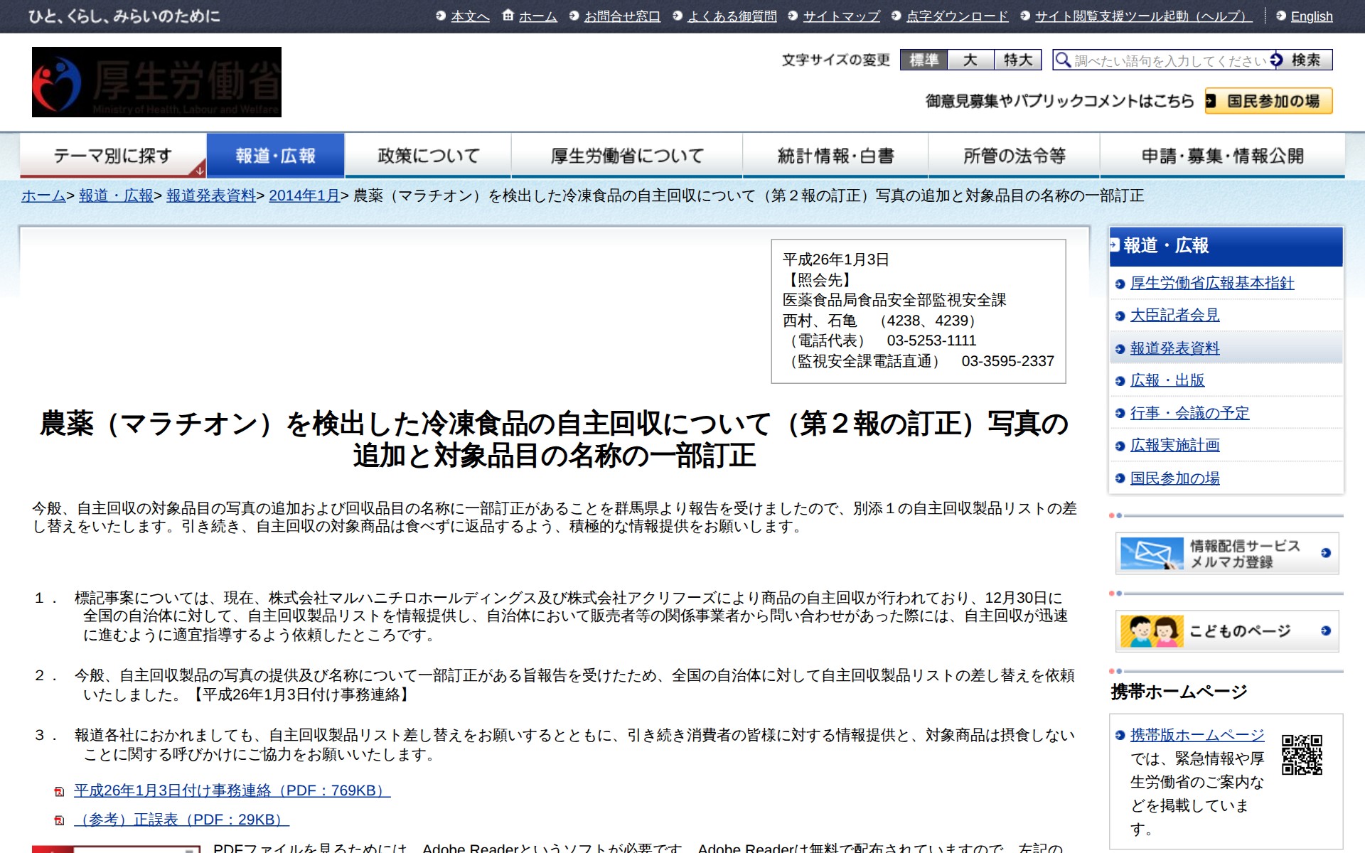 このページは、農薬マラチオンを検出した冷凍食品の自主回収について、厚生労働省が2014年1月3日に公表した第2報の訂正内容を報告するものです。株式会社マルハニチロホールディングスと株式会社アクリフーズが実施している自主回収に関して、群馬県より対象品目の写真追加および名称の一部訂正報告を受けたため、全国自治体に自主回収製品リストの差し替えを依頼しました。消費者に対象商品の摂食を控えるよう呼びかけています。