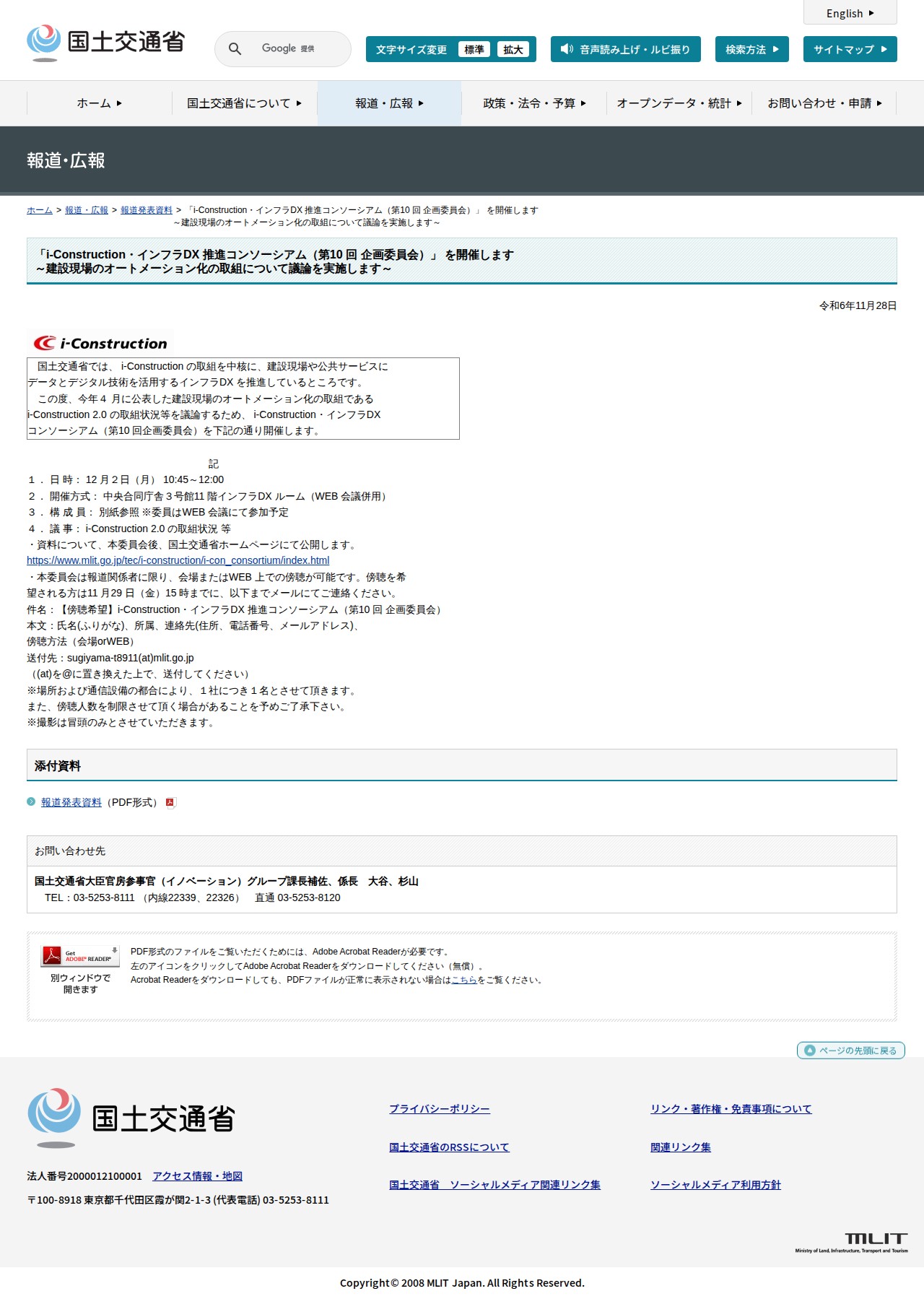 報道発表資料:「i-Construction・インフラDX 推進コンソーシアム(第10 回 企画委員会)」 を開催します<br>~建設現場のオートメーション化の取組について議論を実施します~ - 国土交通省