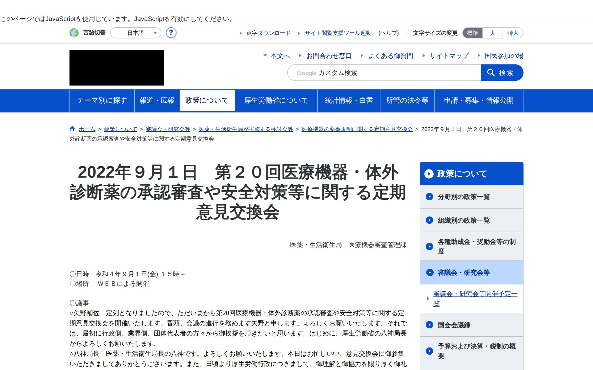 第20回医療機器・体外診断薬の承認審査や安全対策等に関する定期意見交換会 議事録 |厚生労働省