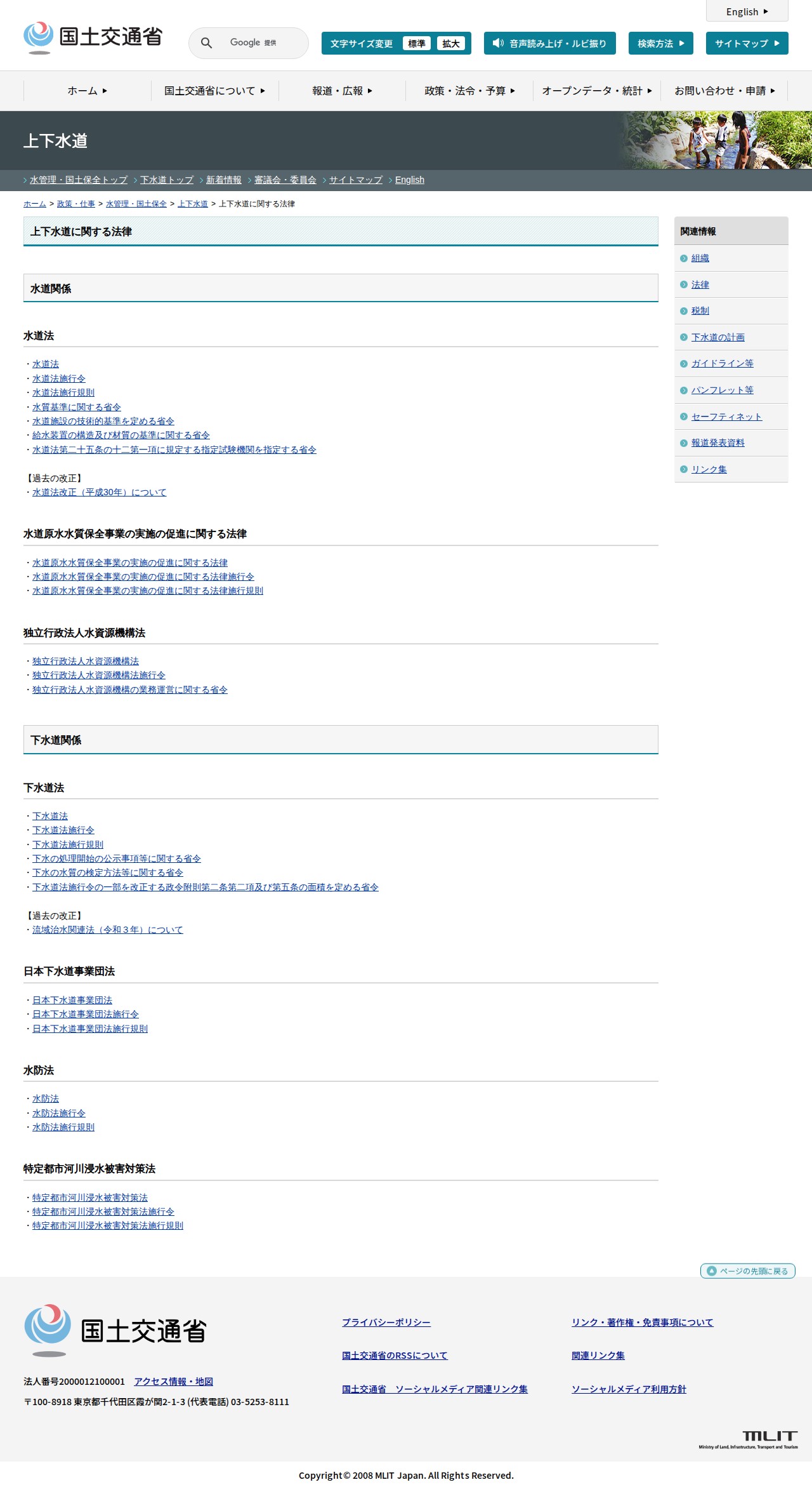 このページは、国土交通省による上下水道に関する法律情報をまとめたものです。水道関係では水道法とその施行令・施行規則、水質基準省令など複数の法令を掲載しており、平成30年の改正情報も提供しています。また水道原水水質保全事業促進法と独立行政法人水資源機構法も掲載。下水道関係では下水道法、日本下水道事業団法、水防法、特定都市河川浸水被害対策法など主要法令とその施行令・施行規則を一覧で提供しています。各法律の詳細へのリンク、過去の改正情報、関連ガイドラインなどへのアクセスも可能です。