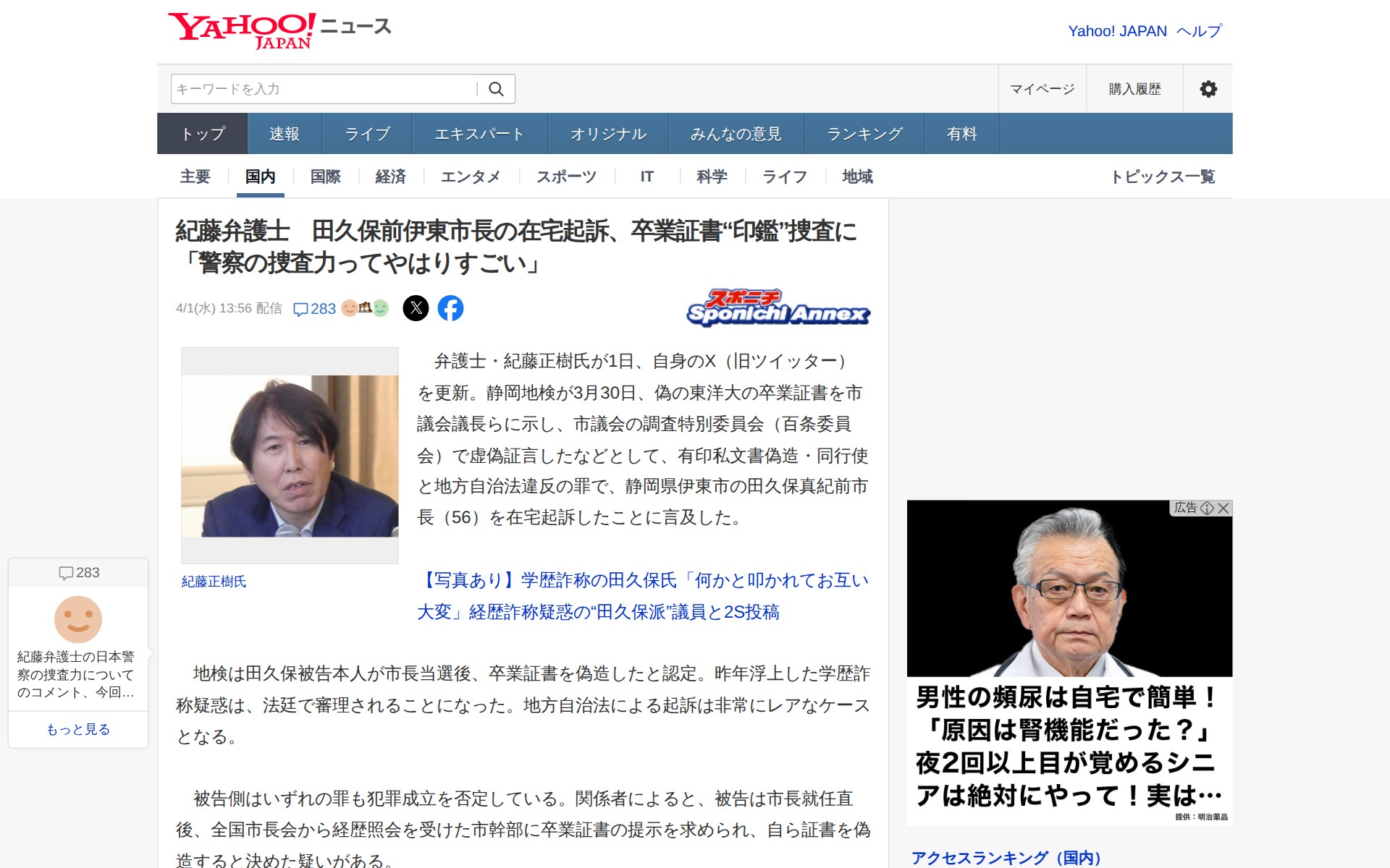 紀藤弁護士 田久保前伊東市長の在宅起訴、卒業証書“印鑑”捜査に「警察の捜査力ってやはりすごい」(スポニチアネックス) - Yahoo!ニュース