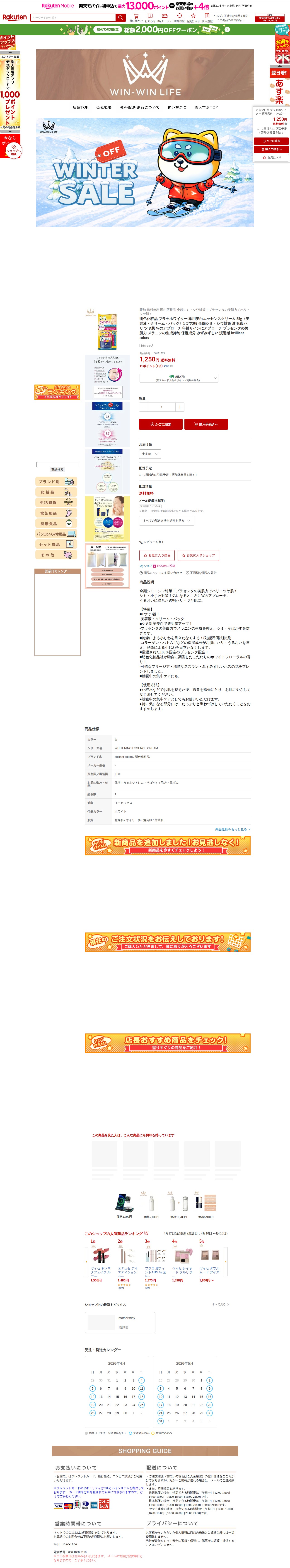 【楽天市場】明色化粧品 プラセホワイター 薬用美白エッセンスクリーム 55g〈美容液・クリーム・パック〉1つで3役 全顔シミ・シワ対策 透明感 ハリ ツヤ肌 Wのアプローチ 年齢サインにアプローチ プラセンタの美肌力 メラニンの生成抑制 保湿成分 みずみずしい 浸透感 brilliant colors:WIN-WIN LIFE【WWJ店】 - 保存されたスクリーンショット