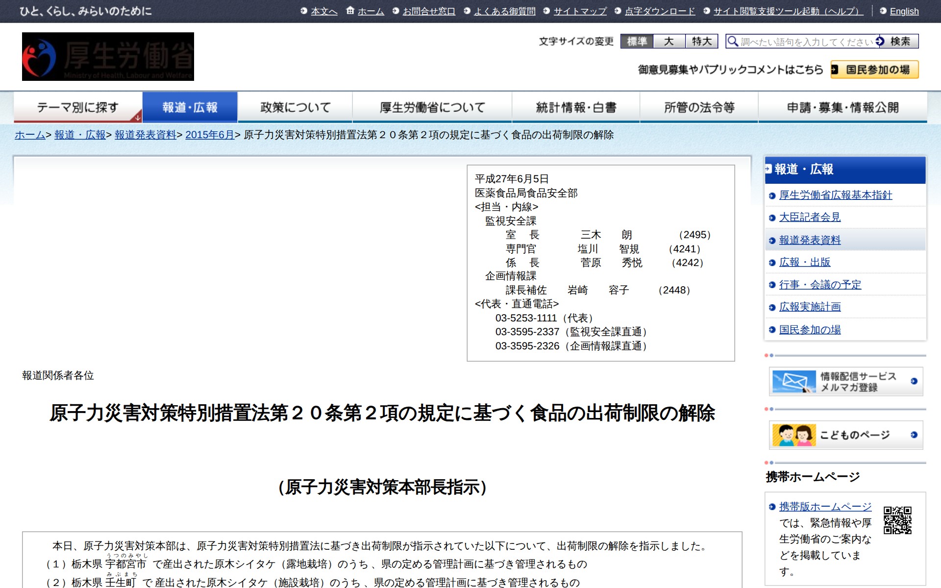 原子力災害対策特別措置法第20条第2項の規定に基づく食品の出荷制限の解除 |報道発表資料|厚生労働省