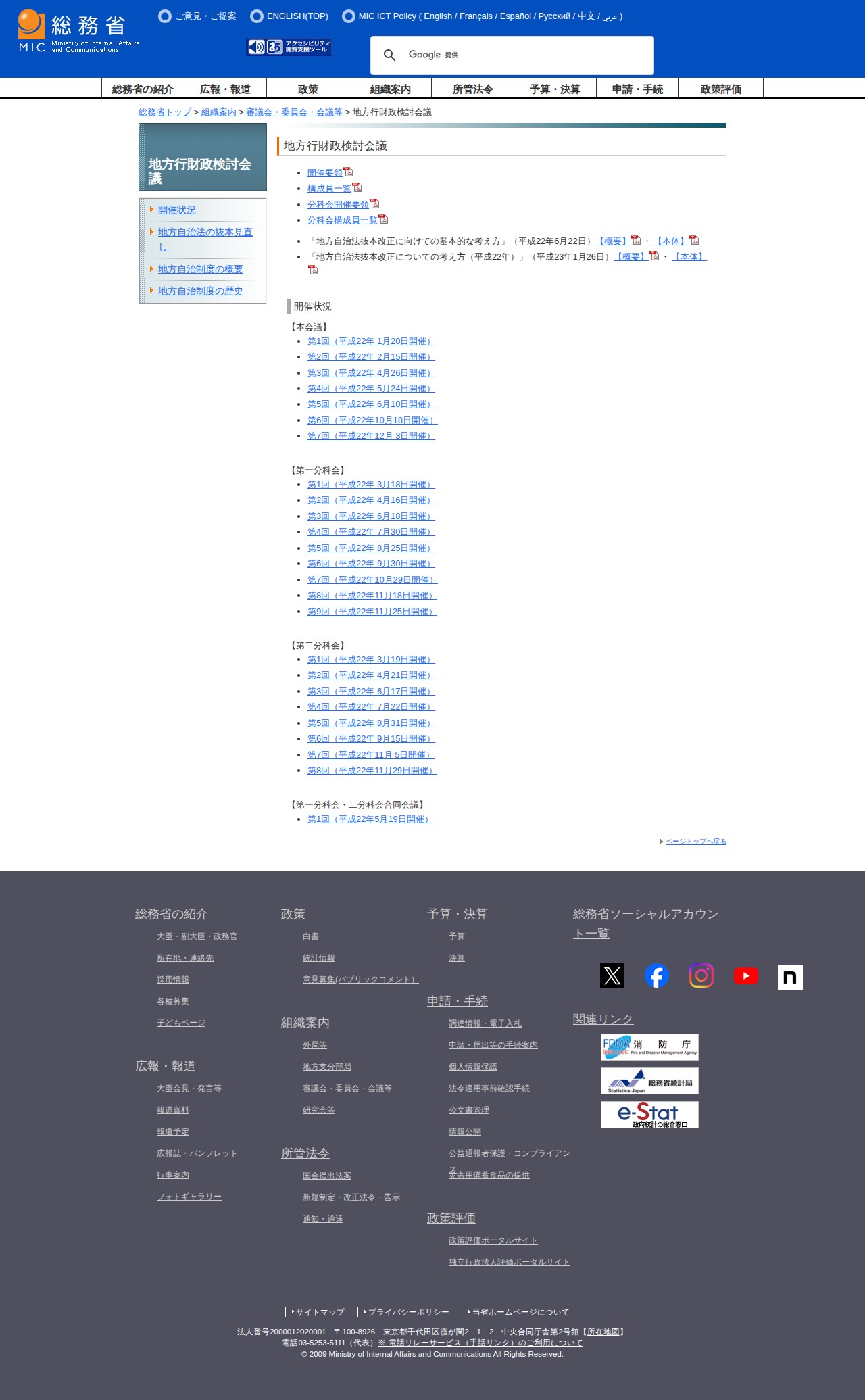 このページは、総務省が設置した地方行財政検討会議に関する情報を掲載しています。地方自治法の抜本改正に向けた基本的な考え方や検討内容についての文書を公開しており、2010年1月から12月にかけて開催された本会議7回と、第一・第二分科会の計17回の会議記録が掲載されています。地方自治制度の改革に関する重要な審議会の活動内容をまとめたページです。
