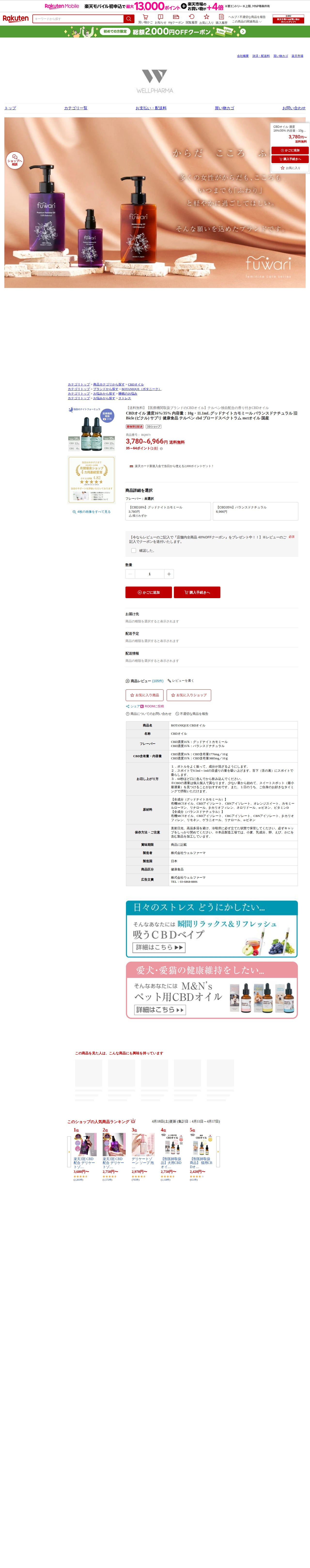 このページは、楽天市場で販売されているBOTANIQUE CBDオイルの商品ページです。濃度16%(グッドナイトカモミール)と35%(バランスドナチュラル)の2種類があり、価格は3,780円から6,966円です。有機MCTオイルをベースにCBDアイソレートやテルペン成分を含み、舌下で摂取します。医療機関取扱ブランドで、日本製の健康食品です。送料無料で、レビュー記入で40%OFFクーポンが付与されます。