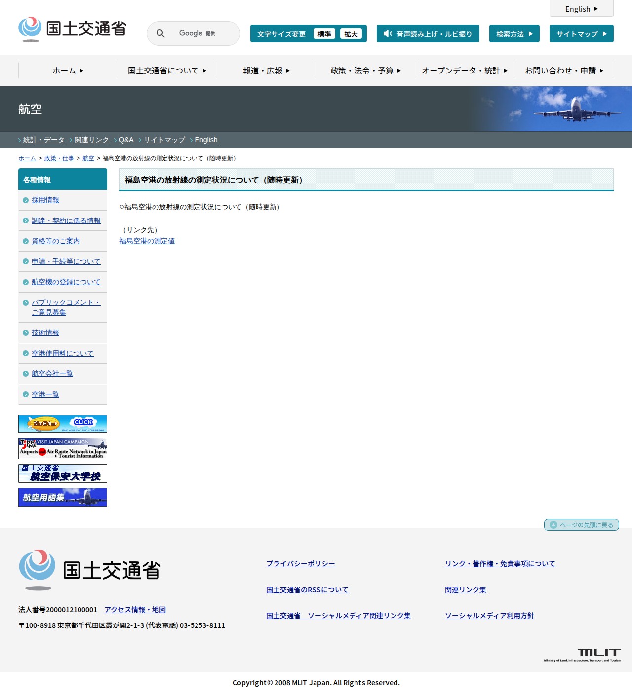 このページは、国土交通省による福島空港の放射線測定状況に関する情報を提供しています。福島空港の放射線測定値は随時更新されており、リンク先で確認できます。ページには航空関連の各種情報や採用情報、調達・契約情報、申請・手続等についての案内も掲載されています。