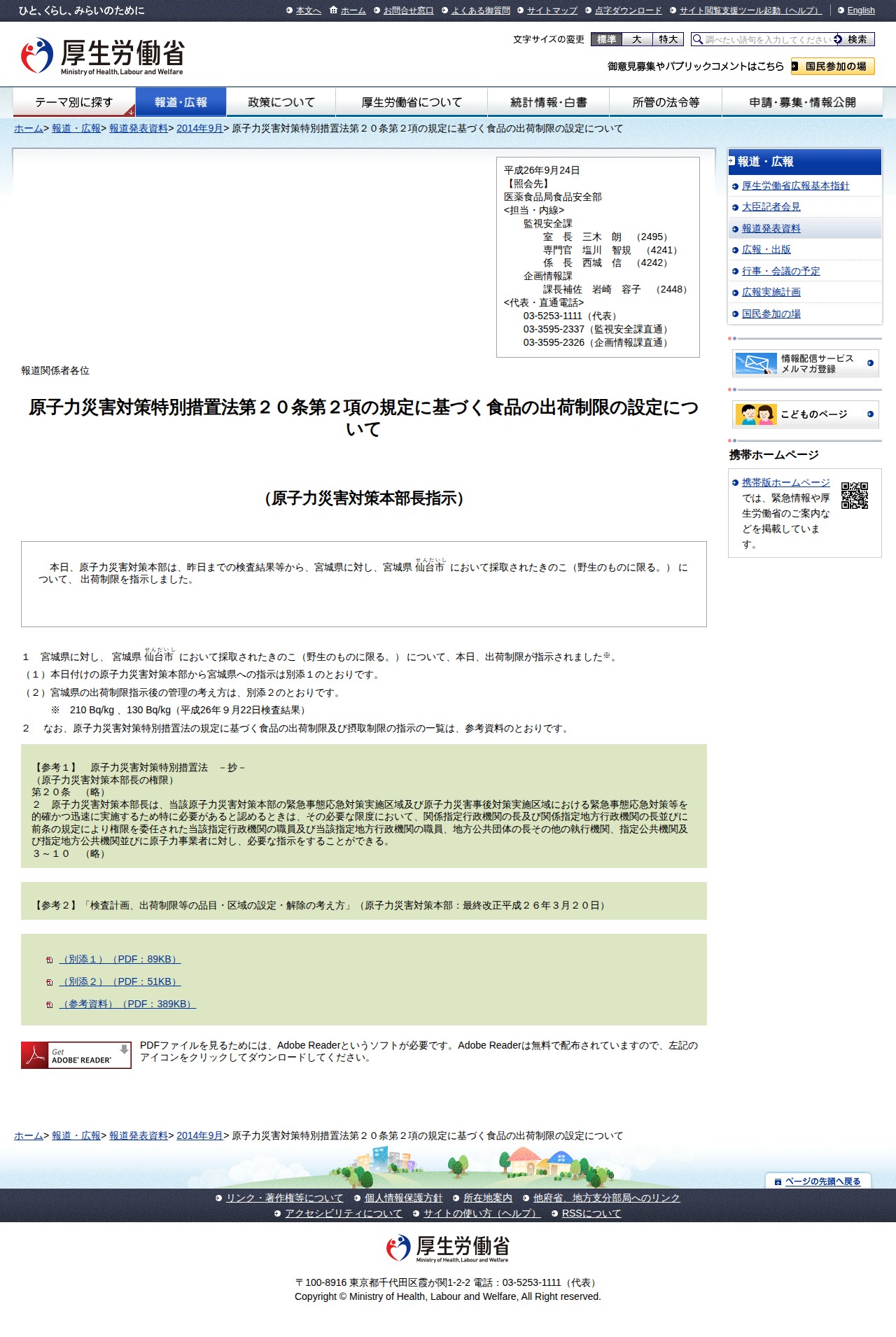 このページは、2014年9月24日付の厚生労働省報道発表資料で、原子力災害対策本部が原子力災害対策特別措置法に基づき、宮城県仙台市で採取された野生きのこに対して出荷制限を指示したことを報告しています。検査結果から放射性物質が検出されたため、当該きのこの出荷が制限されることになりました。資料には指示内容と出荷制限後の管理方針が添付されており、参考資料として他の出荷制限・摂取制限指示の一覧も示されています。