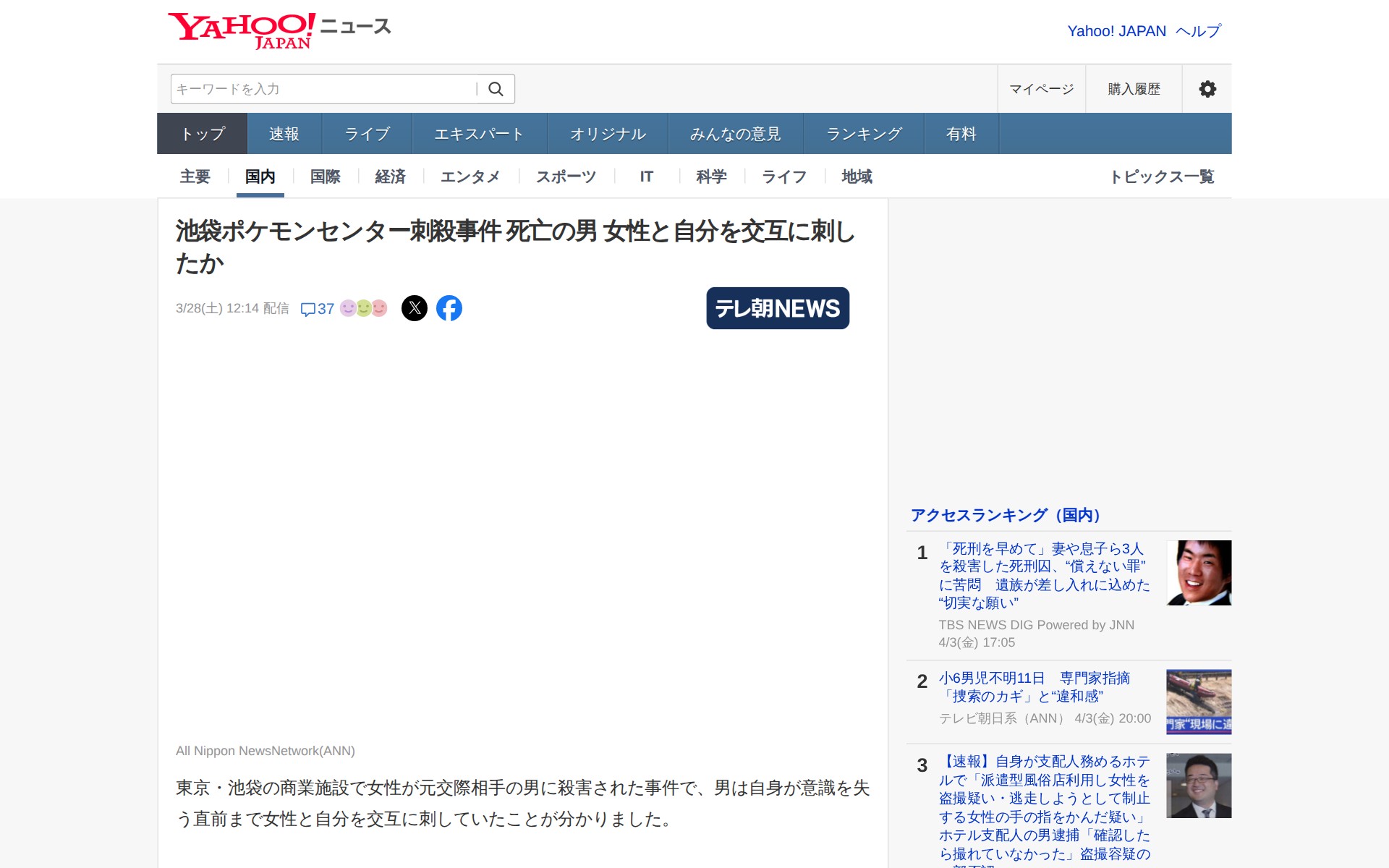 池袋ポケモンセンター刺殺事件 死亡の男 女性と自分を交互に刺したか(テレビ朝日系(ANN)) - Yahoo!ニュース