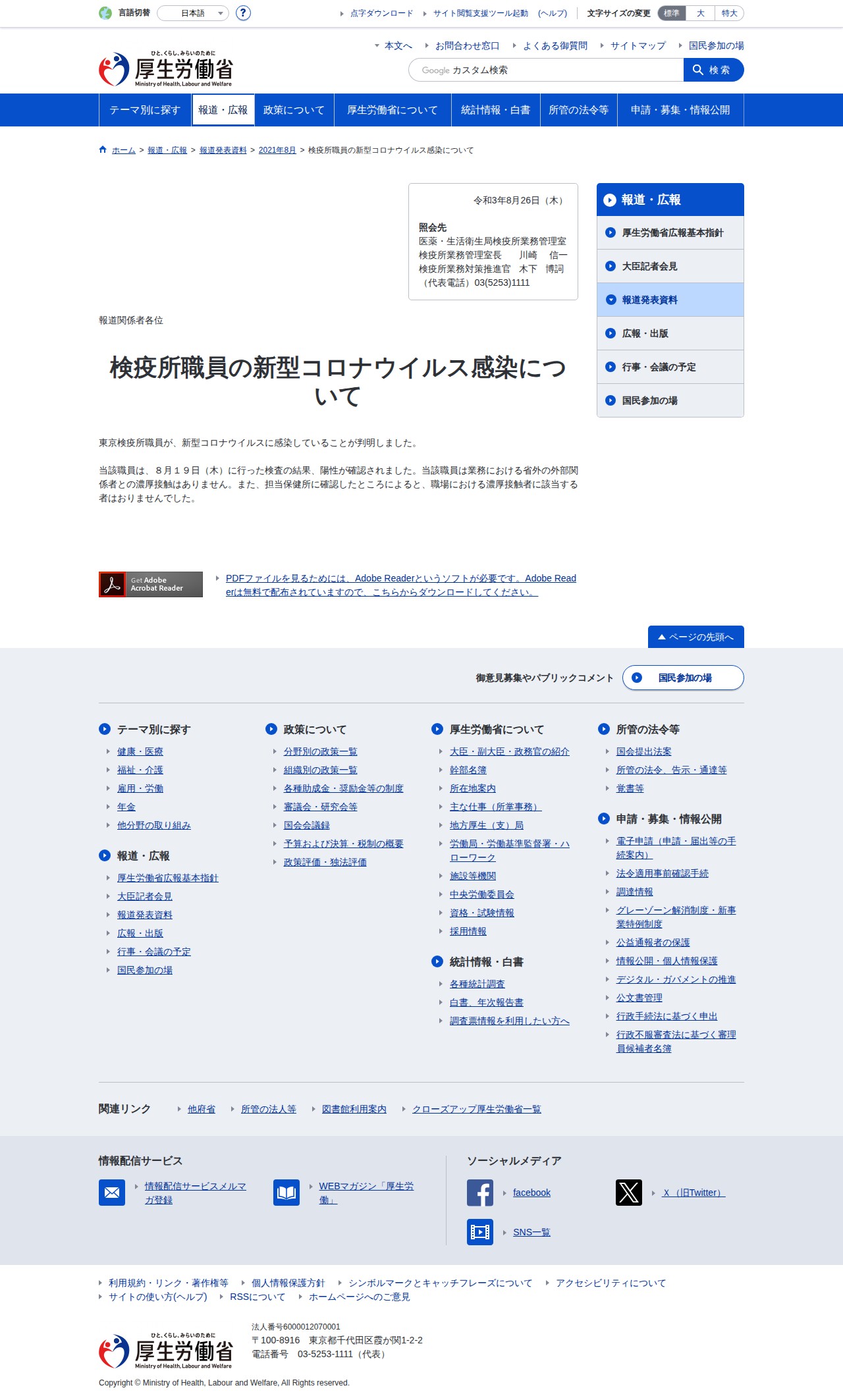 検疫所職員の新型コロナウイルス感染について|厚生労働省 - 保存されたスクリーンショット