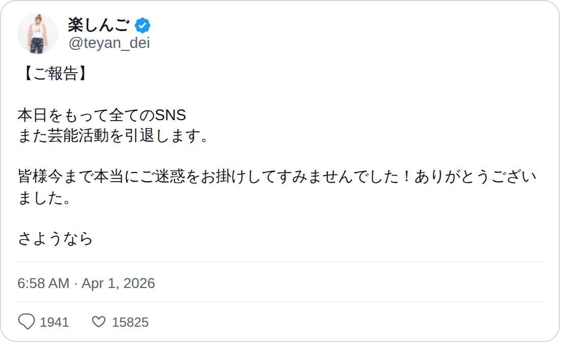 このページは、楽しんご(@teyan_dei)による引退報告です。本人は本日をもってすべてのSNSおよび芸能活動から引退することを発表しています。これまでファンや関係者に迷惑をかけたことについて謝罪し、感謝の言葉を述べて、最後に別れを告げています。