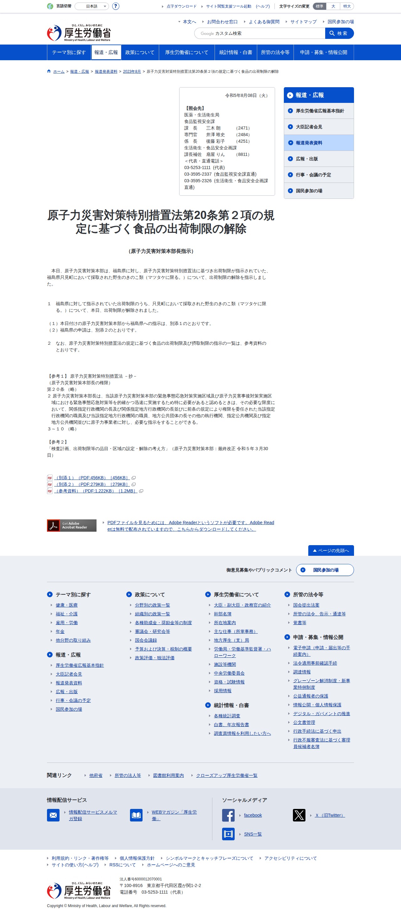 原子力災害対策特別措置法第20条第2項の規定に基づく食品の出荷制限の解除 |厚生労働省