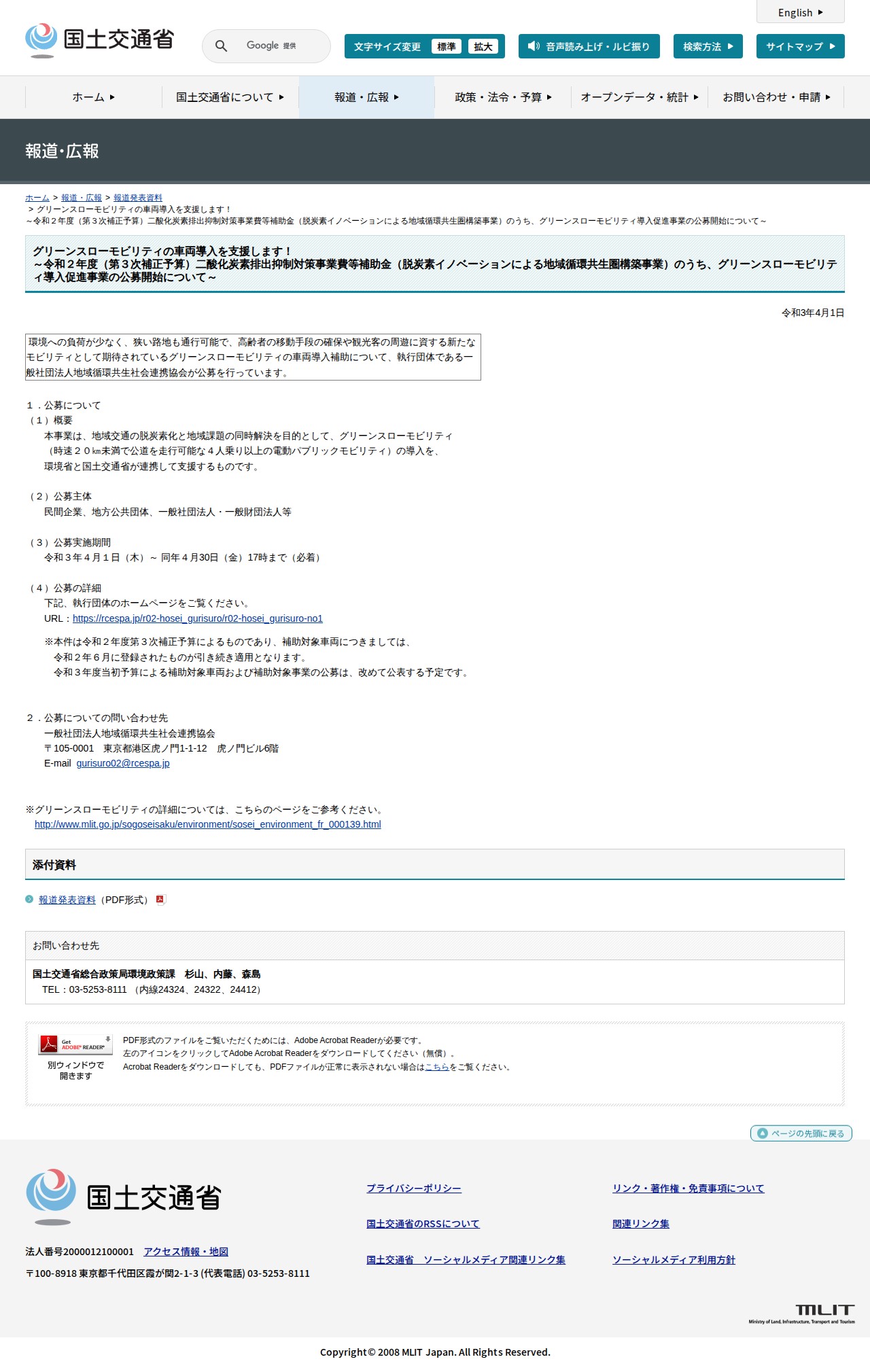 報道発表資料:グリーンスローモビリティの車両導入を支援します!<br>~令和2年度(第3次補正予算)二酸化炭素排出抑制対策事業費等補助金(脱炭素イノベーションによる地域循環共生圏構築事業)のうち、グリーンスローモビリティ導入促進事業の公募開始について~ - 国土交通省