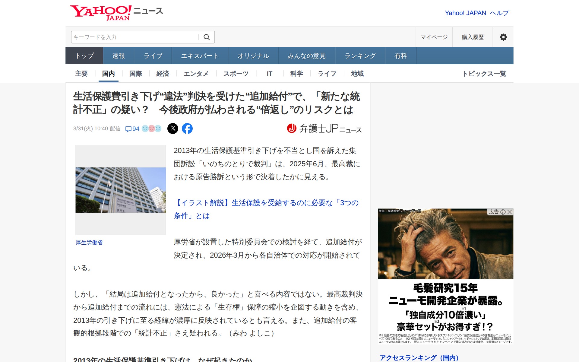 生活保護費引き下げ“違法”判決を受けた“追加給付”で、「新たな統計不正」の疑い? 今後政府が払わされる“倍返し”のリスクとは(弁護士JPニュース) - Yahoo!ニュース