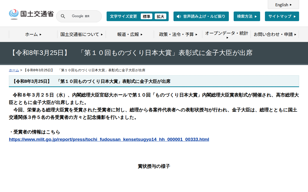【令和8年3月25日】 「第10回ものづくり日本大賞」表彰式に金子大臣が出席 - 国土交通省 - 保存されたスクリーンショット