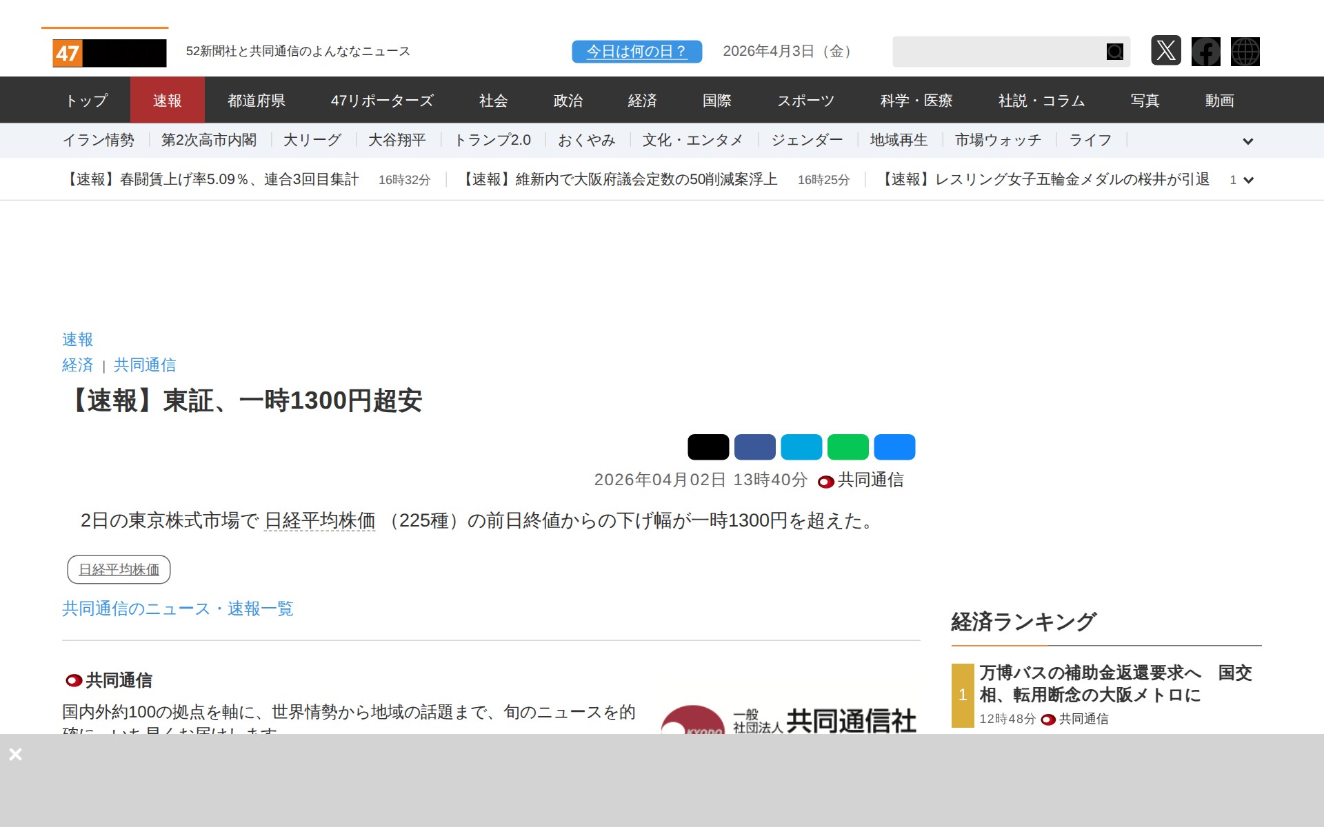 このページは、2026年4月2日の東京株式市場における日経平均株価の動きを報じた速報記事です。日中、日経平均株価の下げ幅が一時1300円を超えたことが伝えられています。記事には複数の関連ニュースも掲載されており、同日の株価の変動や市場の動向、トランプ大統領演説の影響など、経済関連の速報情報が集約されています。