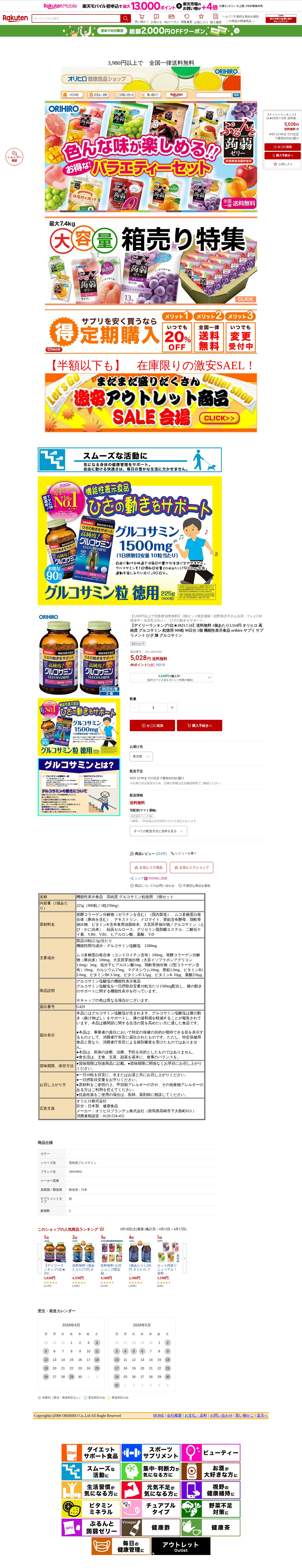 このページはオリヒロの高純度グルコサミンサプリメントの商品紹介ページです。2個セットで5,028円、送料無料で販売されています。900粒(90日分)入りで、1日10粒を目安に摂取します。グルコサミン塩酸塩1500mg配合の機能性表示食品で、膝の動きをサポートし違和感を軽減することが報告されています。コンドロイチン、コラーゲン、ヒアルロン酸など関連成分も含有。2023年7月24日のデイリーランキング1位で、テレビCM放送中の人気商品です。