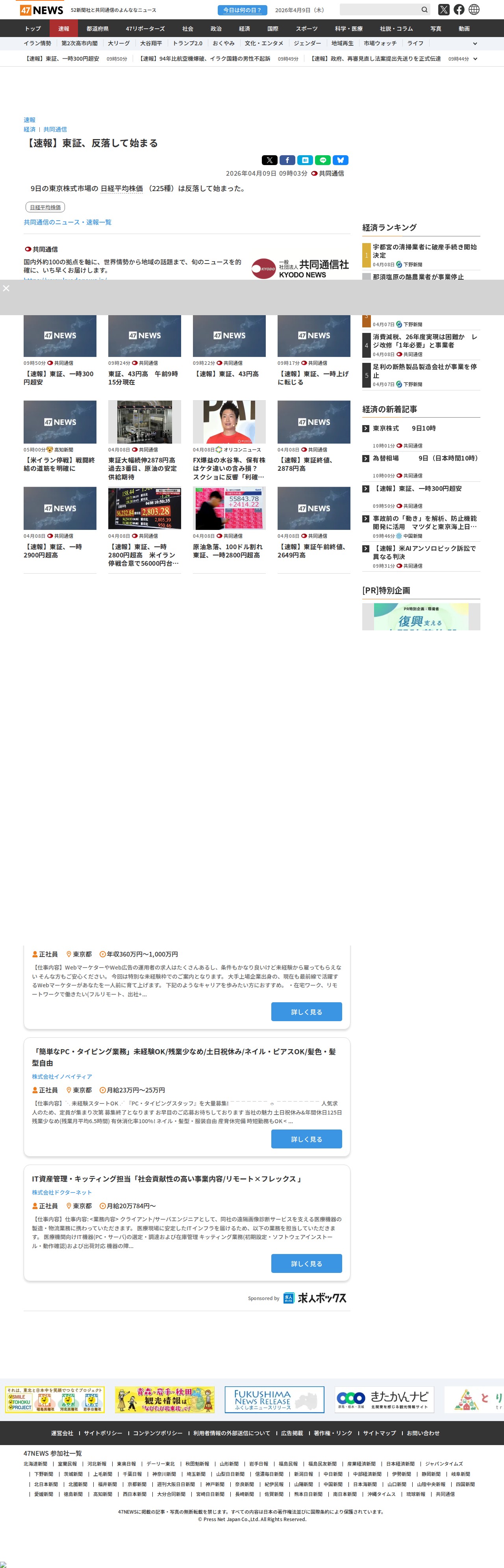 このページは、2026年4月9日の東京株式市場の速報を伝えるものです。日経平均株価(225種)が反落して始まったことが報じられています。ページには複数の速報が掲載されており、午前9時50分の速報では一時300円超安となったことが示されています。その後、午前9時24分には43円高に転じ、午前9時17分には一時上げに転じるなど、変動が続いています。ページには求人情報やランキング、関連ニュースも掲載されています。