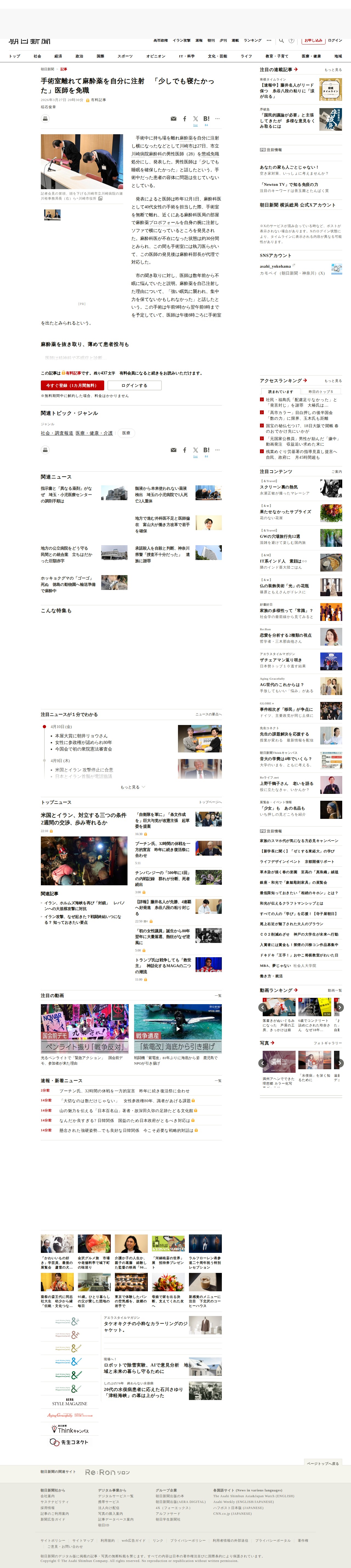 手術室離れて麻酔薬を自分に注射 「少しでも寝たかった」医師を免職 [神奈川県]:朝日新聞 - 保存されたスクリーンショット