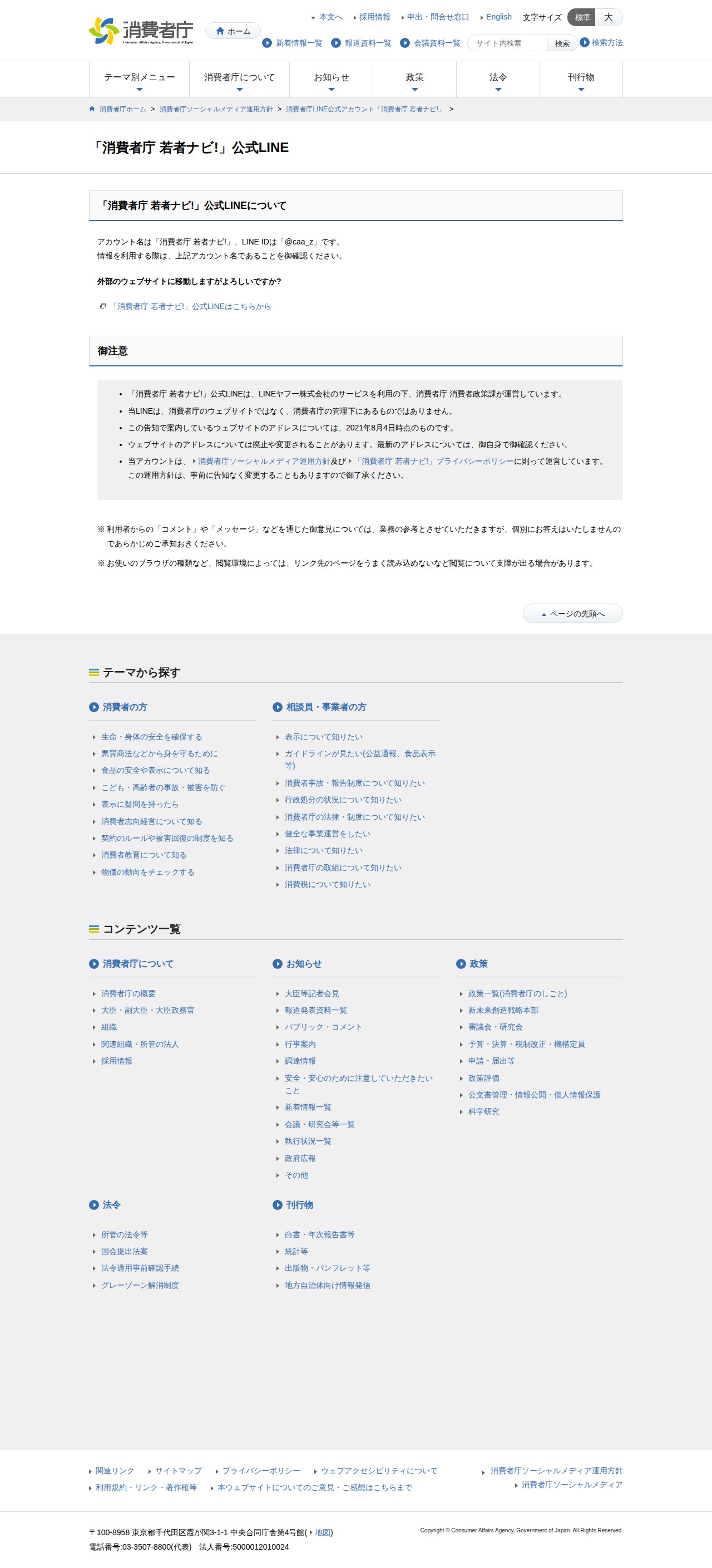 このページは、消費者庁の公式LINE「消費者庁 若者ナビ!」(LINE ID:@caa_z)について案内しています。このアカウントはLINEヤフー株式会社のサービスを利用し、消費者庁消費者政策課が運営しています。利用者からのコメントやメッセージは業務の参考にされますが、個別の返答はありません。ウェブサイトのアドレスは変更される可能性があるため、最新情報の確認が必要です。当LINEは消費者庁ソーシャルメディア運用方針とプライバシーポリシーに従って運営されています。