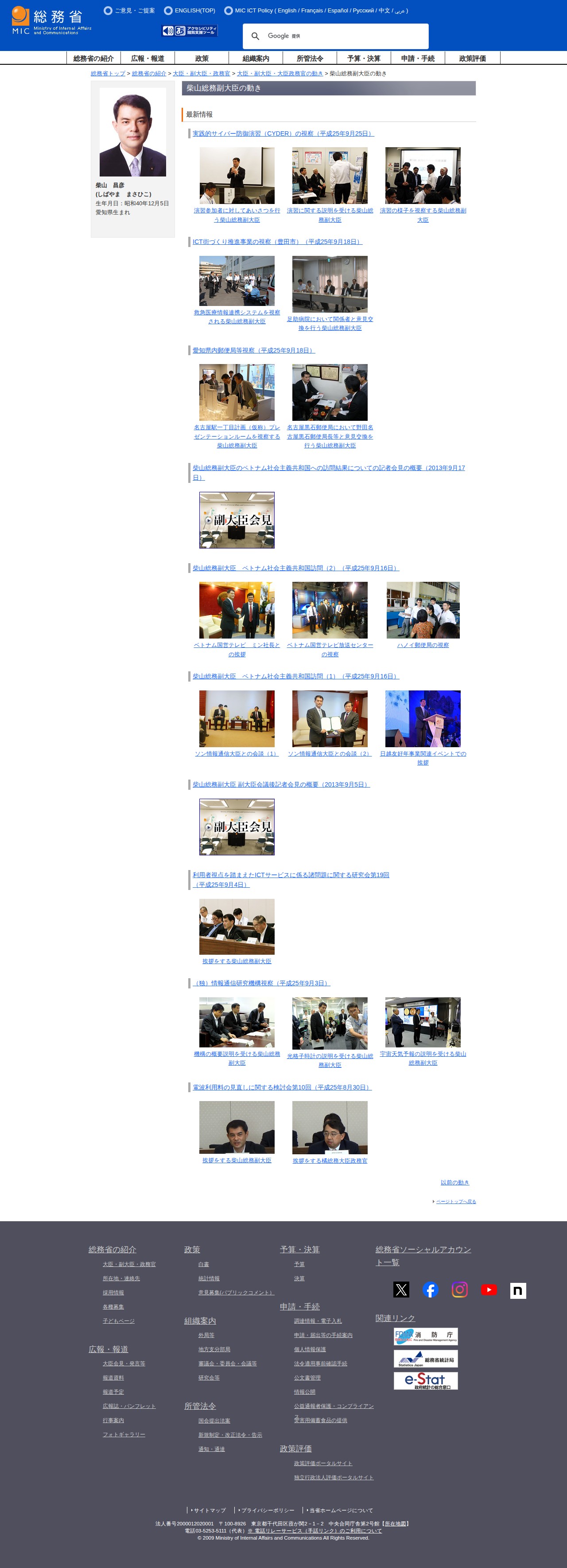 このページは、柴山総務副大臣の公務活動記録を掲載している総務省の公式ページです。2013年8月から9月にかけての活動が記載されており、実践的サイバー防御演習の視察、ICT街づくり推進事業の視察、郵便局視察、ベトナム訪問、情報通信研究機構視察など、多岐にわたる公務活動の詳細が写真付きで紹介されています。副大臣の基本情報として、昭和40年12月5日生まれ、愛知県出身であることも記載されています。